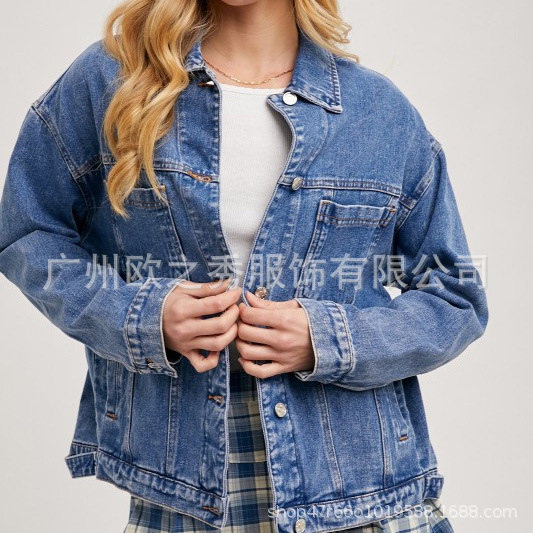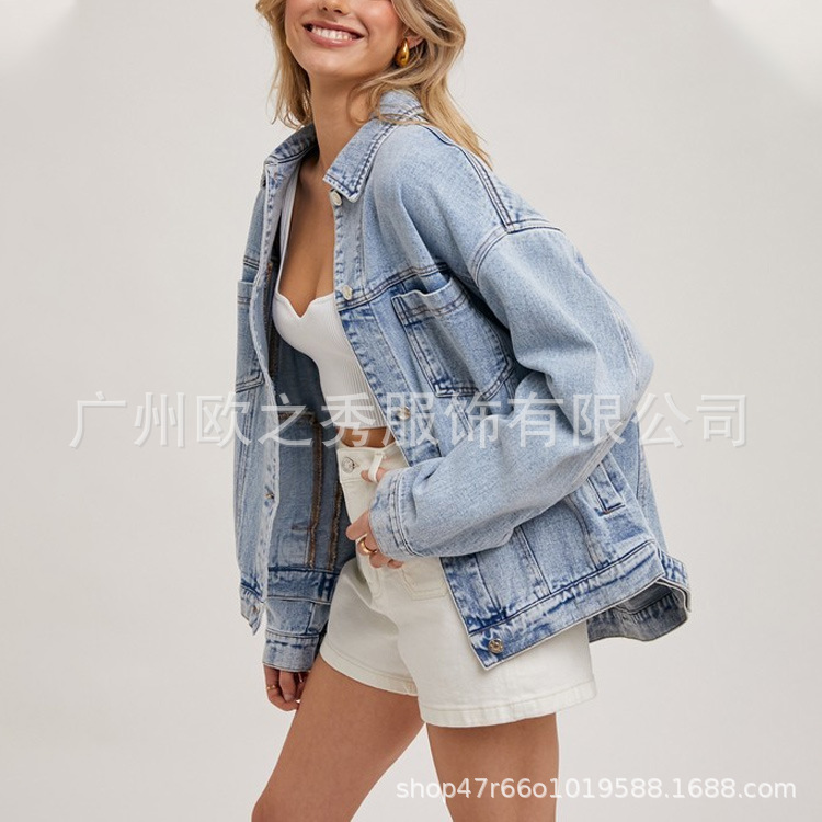Главная страница > 2025 новая европейская и американская джинсовая куртка для женщин, однотонная, свободного кроя, с длинными рукавами, потертая, с отложным воротником