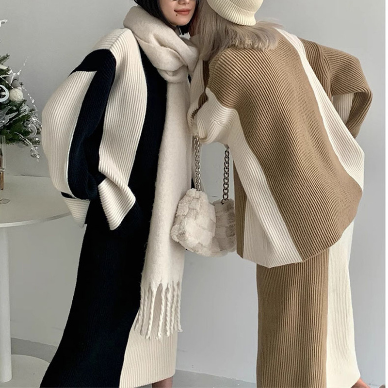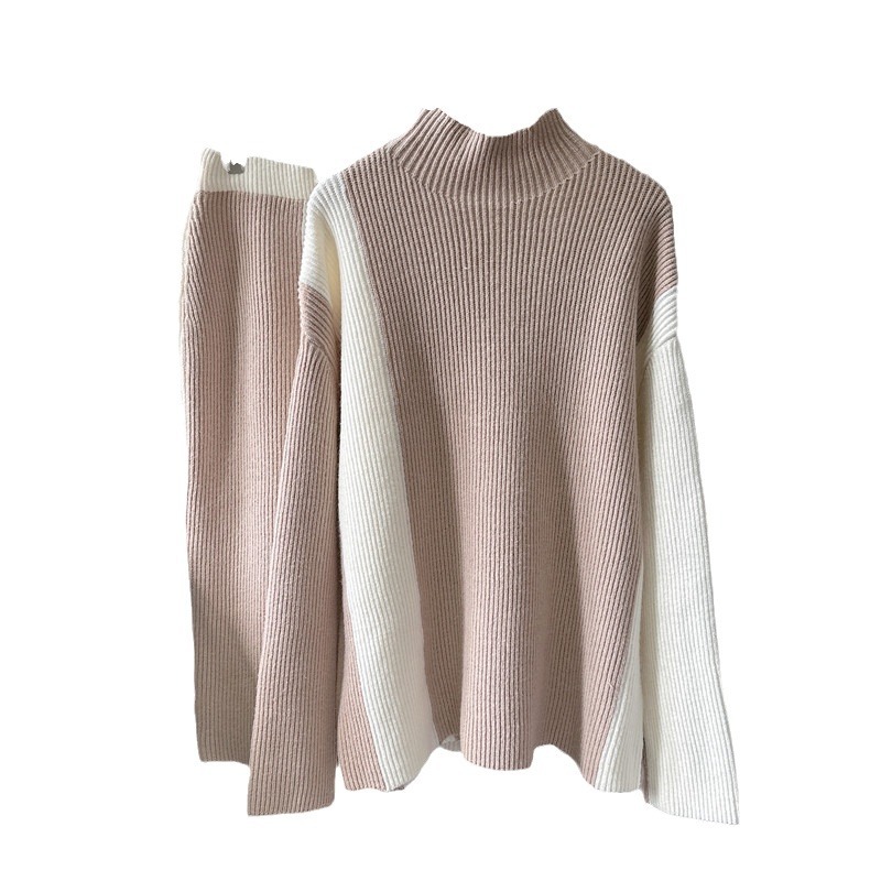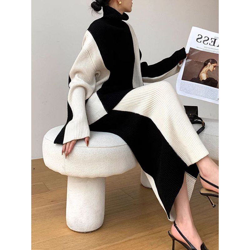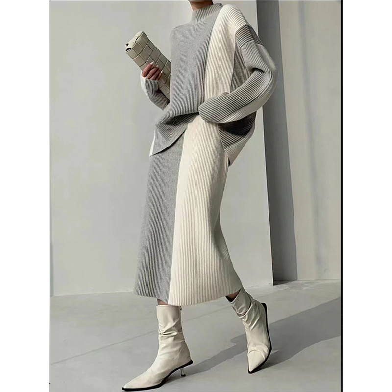 Главная страница > Трансграничный осенне-зимний новый пуловер, женский высококачественный дизайн, трикотажный костюм контрастного цвета, юбка, комплект из двух предметов