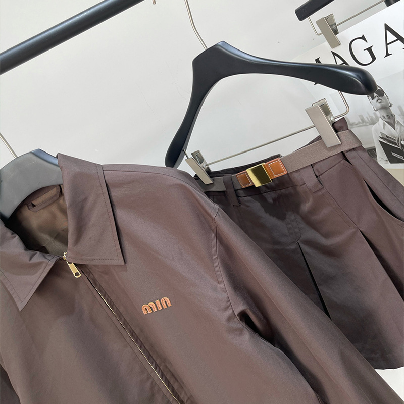 Главная страница > 2025 Весна-Лето Кожаная куртка с молнией в цвете какао-коричневый, пояс с буквами, плиссированная юбка, свободные топы для мужчин и женщин