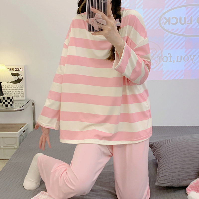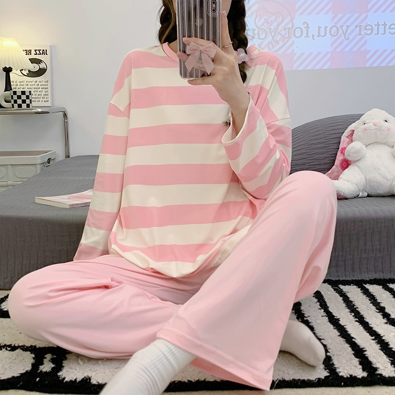 Главная страница > Пижама, Женский весенне-осенний костюм с длинными рукавами из искусственного хлопка, свободные ленивые брюки в японском стиле, домашняя одежда, повседневный комплект из двух предметов в полоску