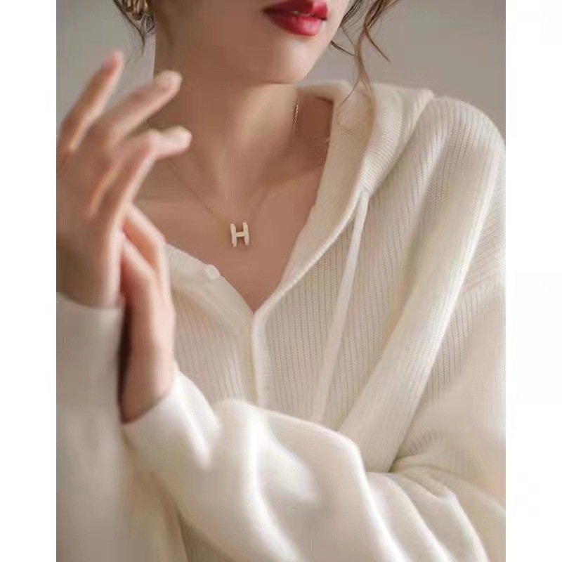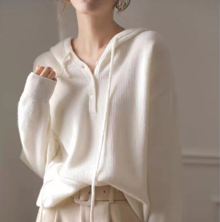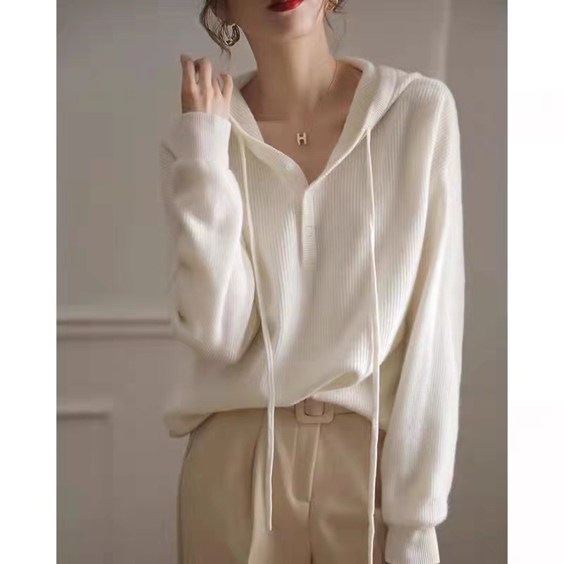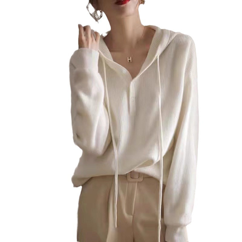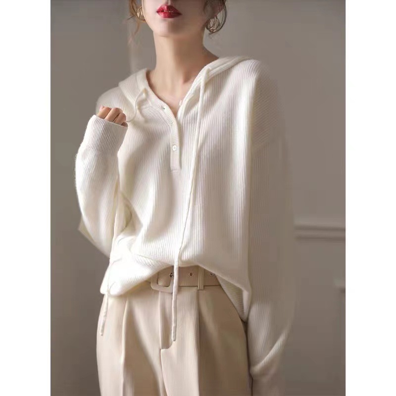 Главная страница > Белый вязаный свитер с капюшоном для женщин, новинка ранней осени 2025, топ в стиле «lazy», тонкий однотонный свитер с V-образным вырезом в стиле толстовки.
