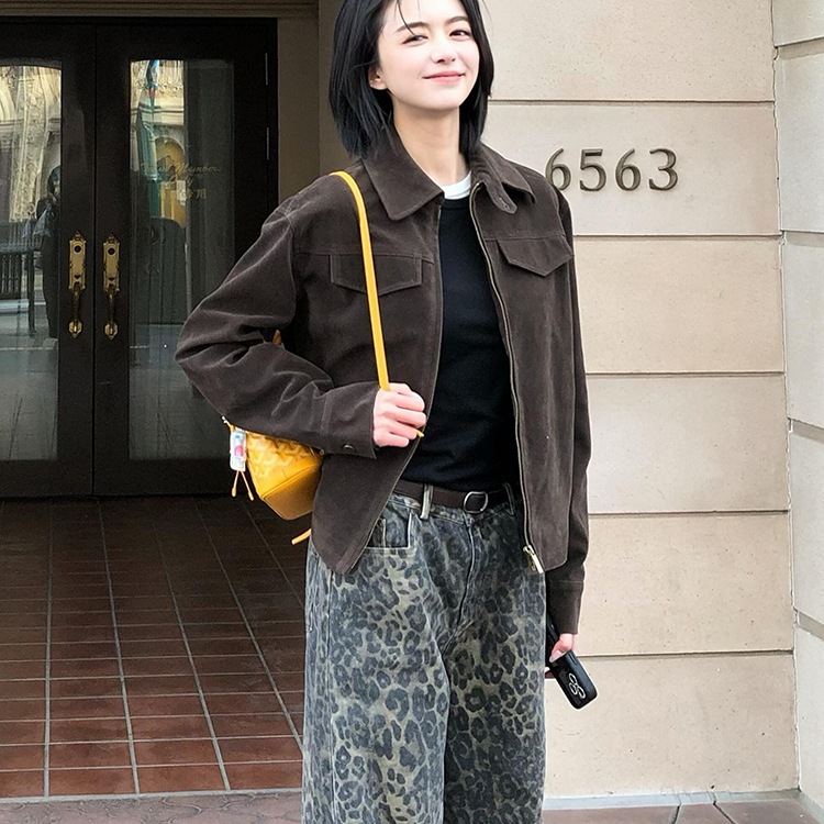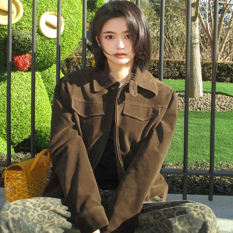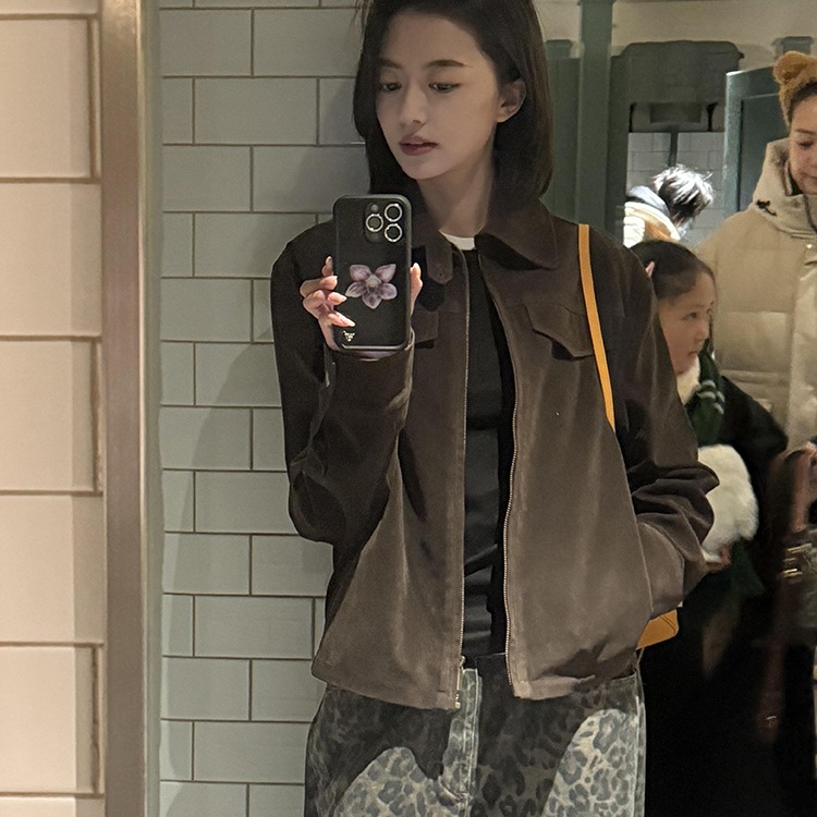 Главная страница > Коричневая замшевая куртка для женщин весна 2025 новая свободная универсальная короткая куртка на молнии повседневная модная верхняя одежда
