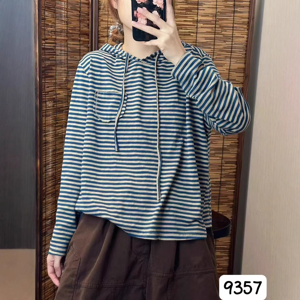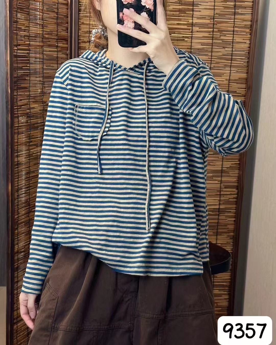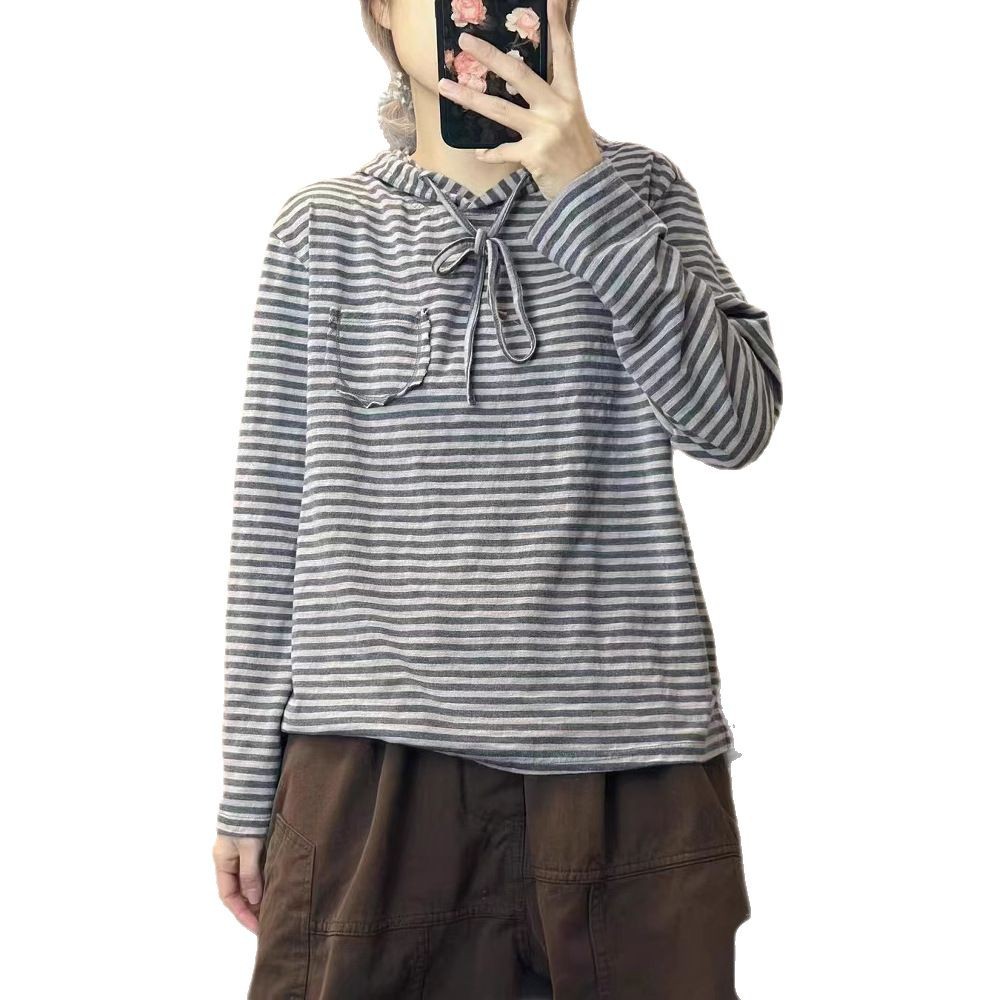 Главная страница > 2025 Весенняя капюшона с шапкой, дамы литературные фанаты с длинными рукавами в полоску, свободная хлопчатобумажная рубашка, толстовка с капюшоном