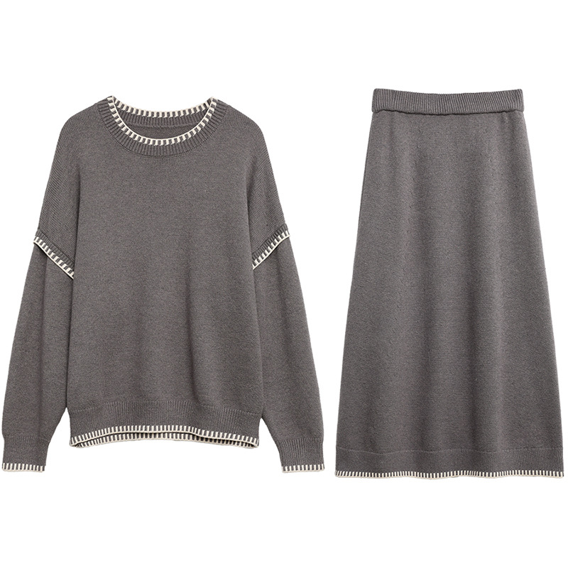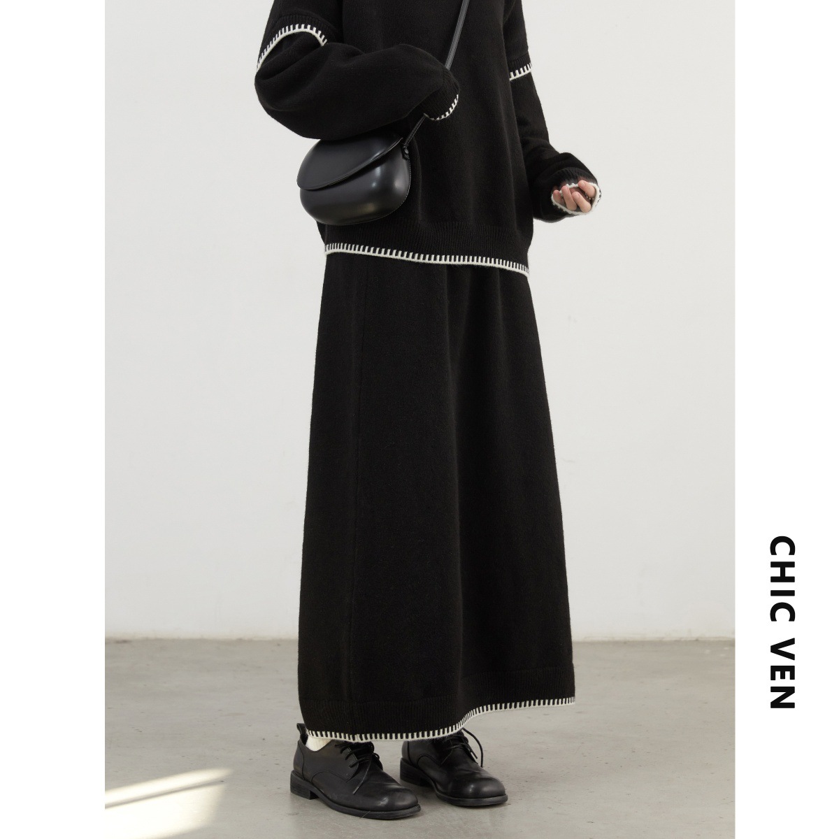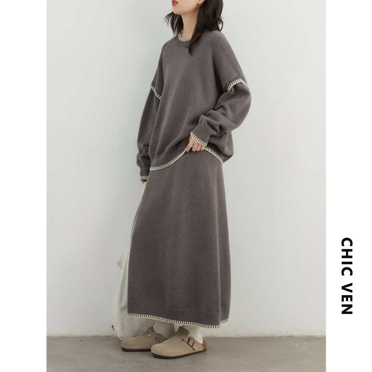 Главная страница > CHICVEN свободный осенний новый стильный свитер с круглым вырезом и контрастными краями, вязаный костюм с юбкой для женщин