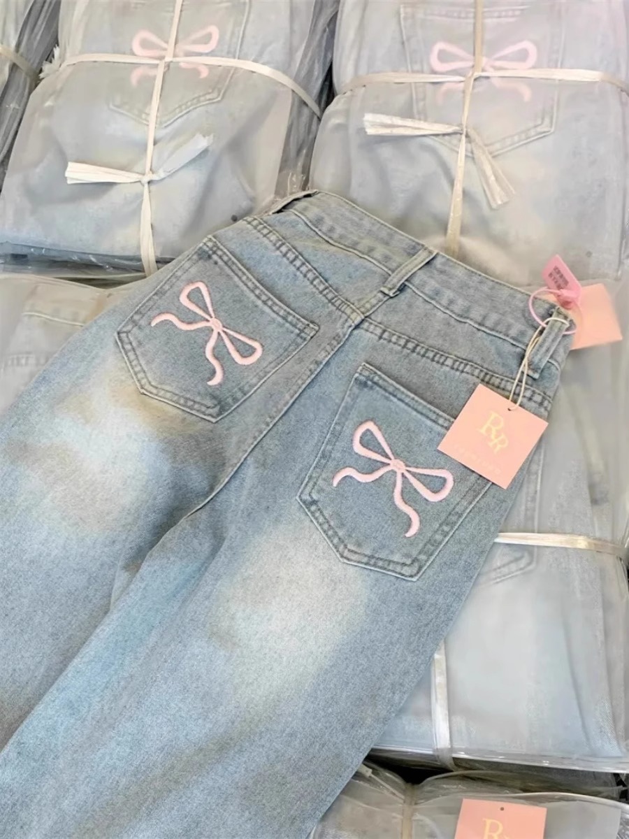 Главная страница > 2025 новый дизайн джинсы с вышивкой бантом женские летние ретро высокая талия прямые брюки широкие длинные штаны