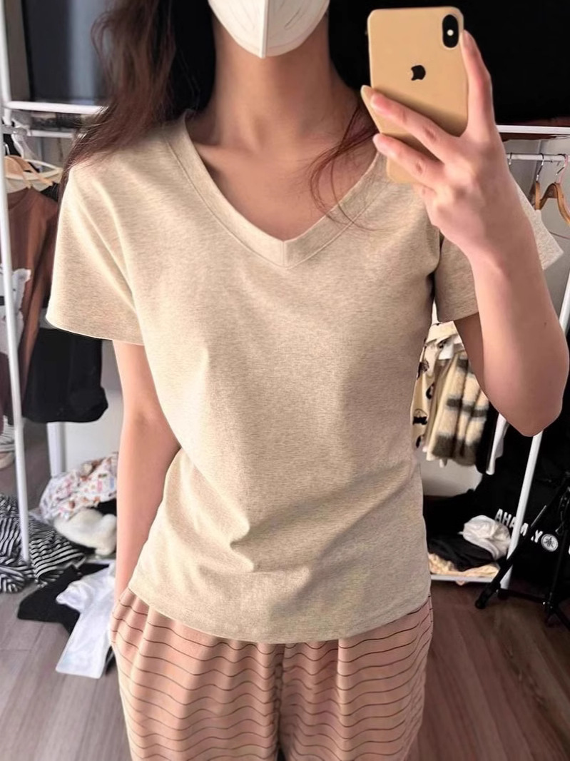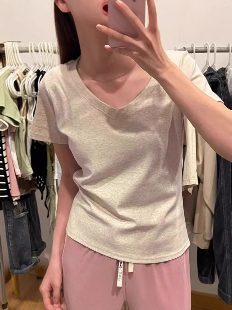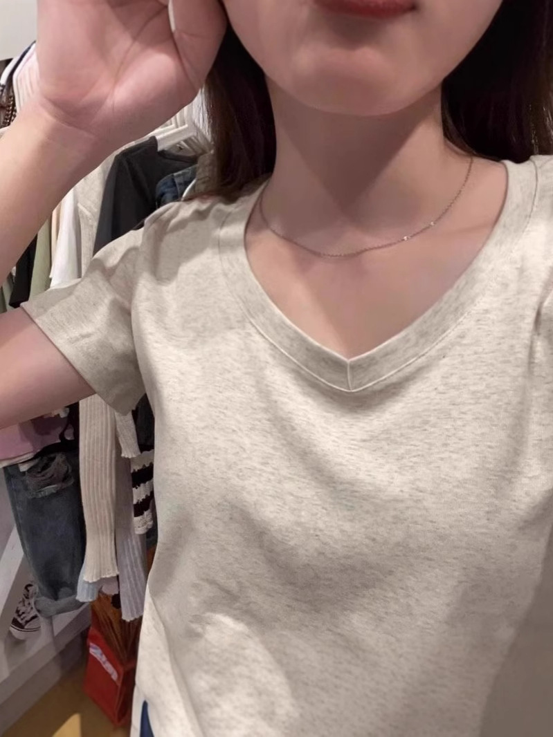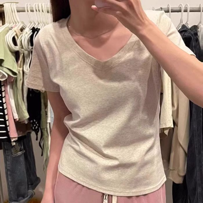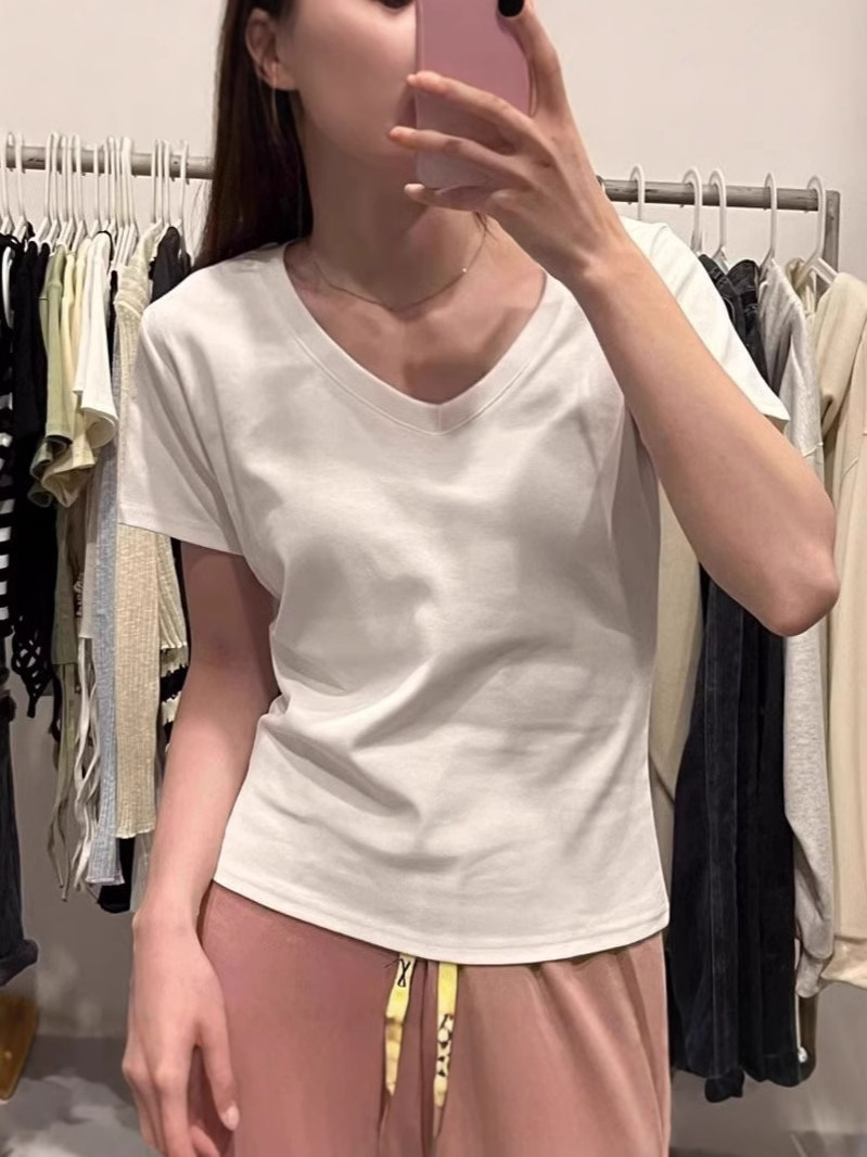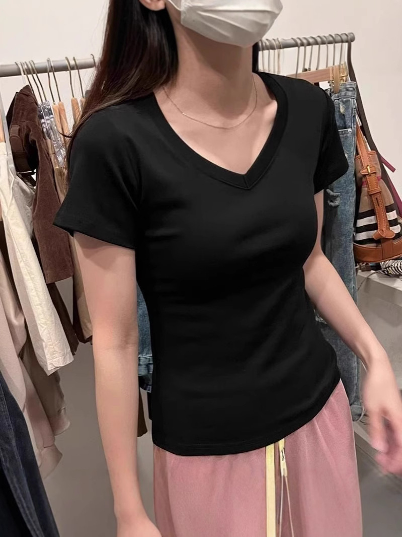 Главная страница > Стильная минималистская футболка с v-образным вырезом с положительным плечом женская футболка с короткими рукавами летом тонкая повседневная сетка красная одежда прилив спандекс