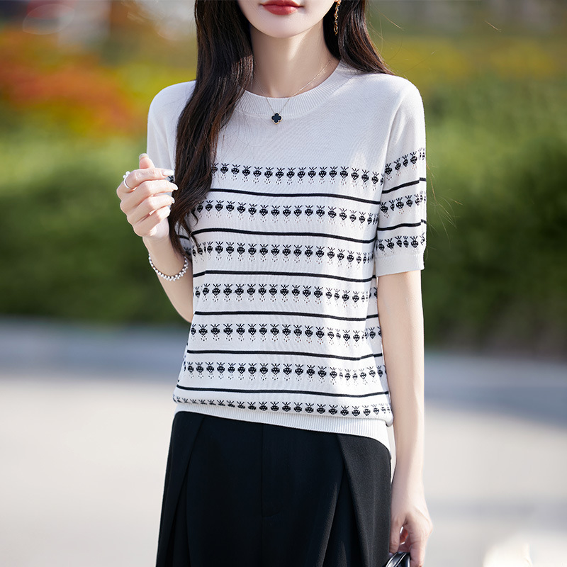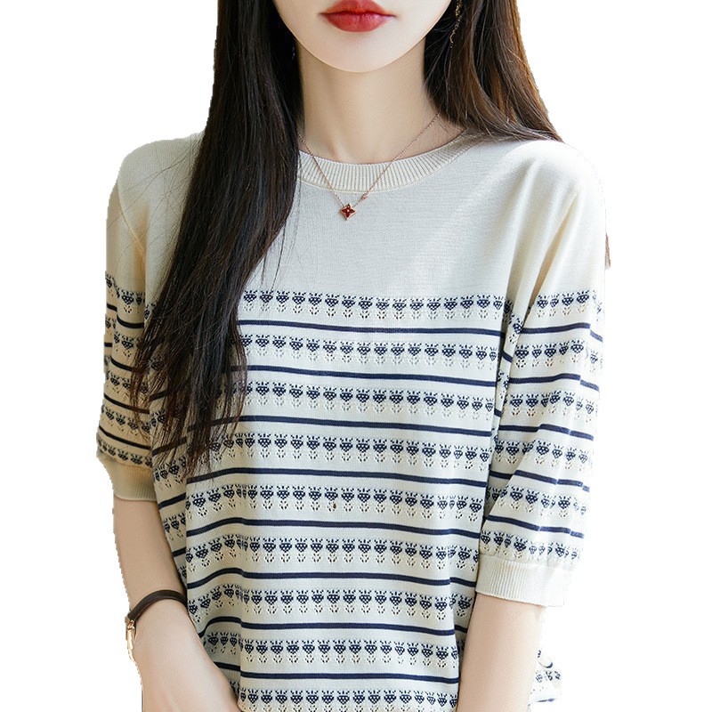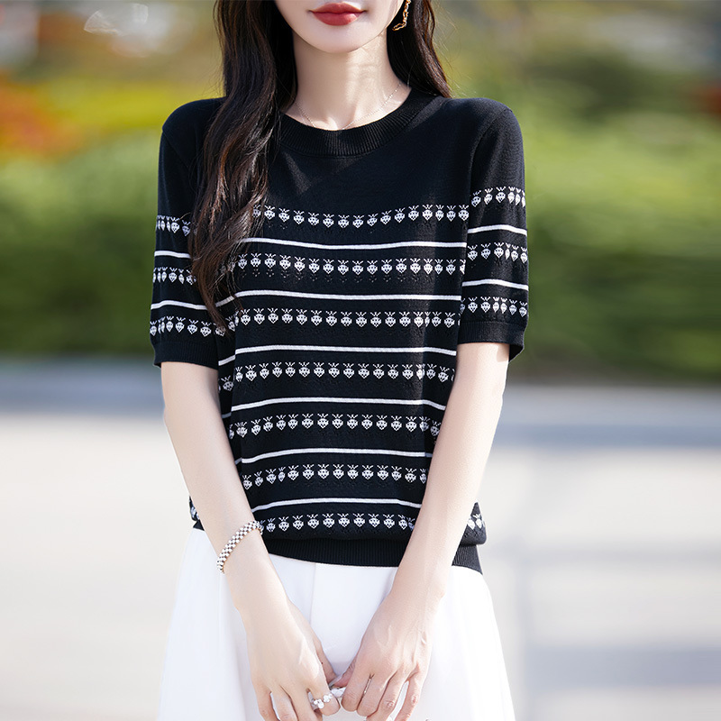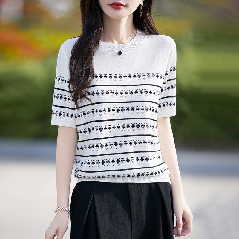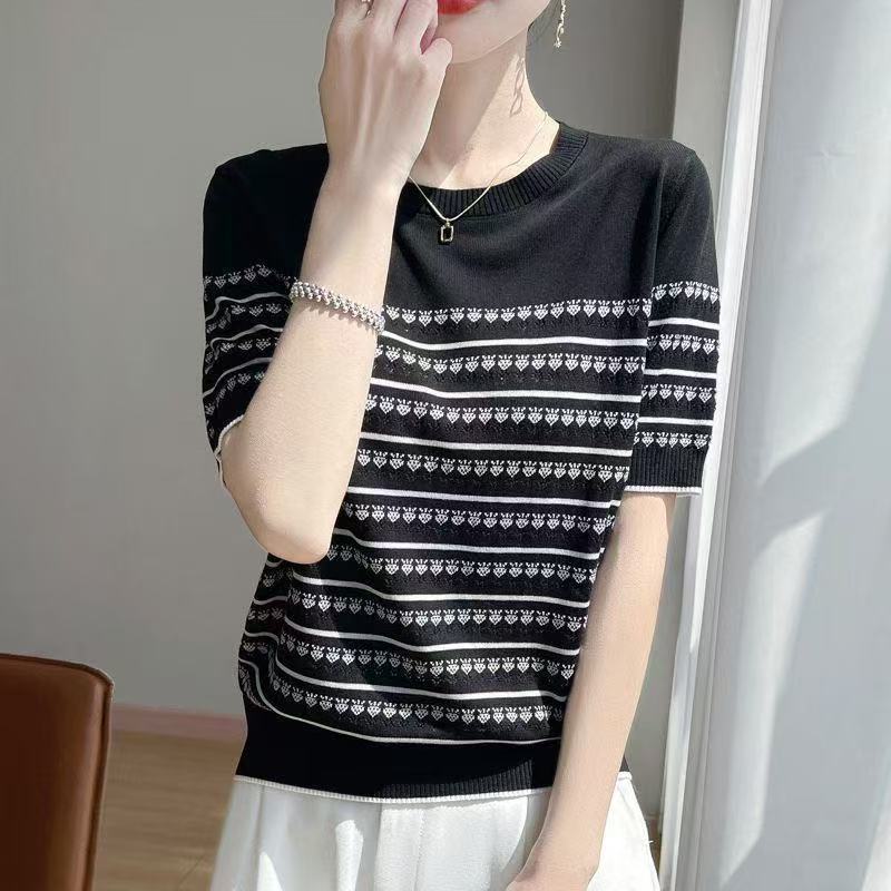 Главная страница > Лето 2025, элегантный трикотаж с круглым вырезом из ледяного шелка в полоску, женская футболка с короткими рукавами, универсальный утягивающий модный тонкий топ