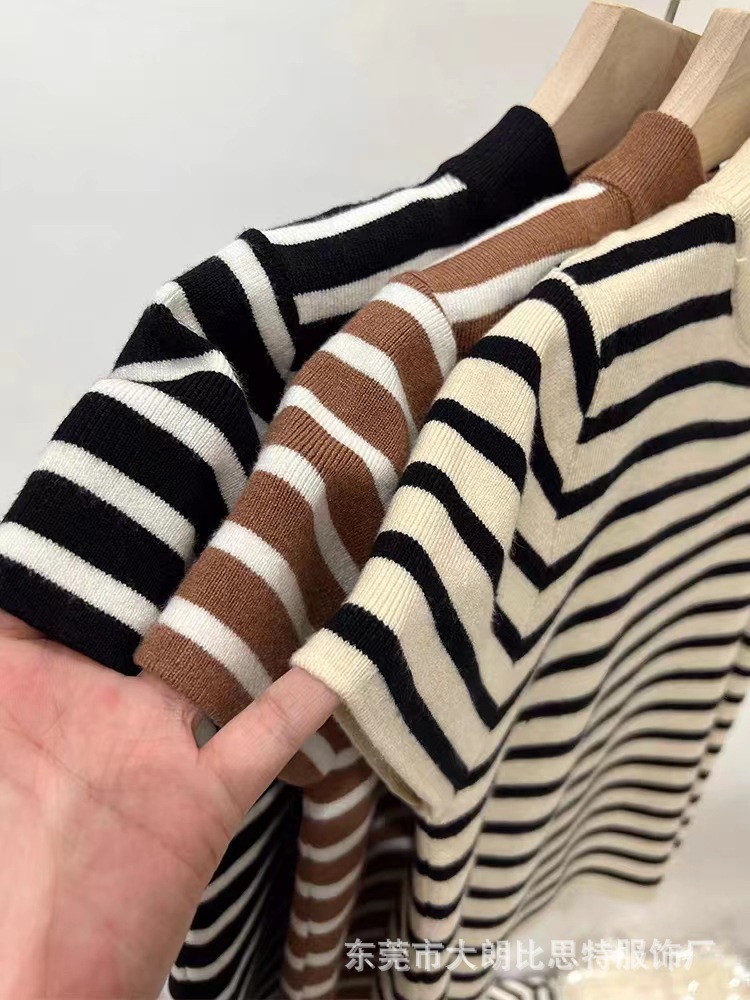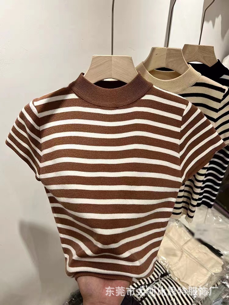 Главная страница > 2023 осенний костюм новый пол-высокий воротник в полоску с нижним дном трикотаж женский тонкий тонкий с короткими рукавами футболка с ледяным шелком на плече