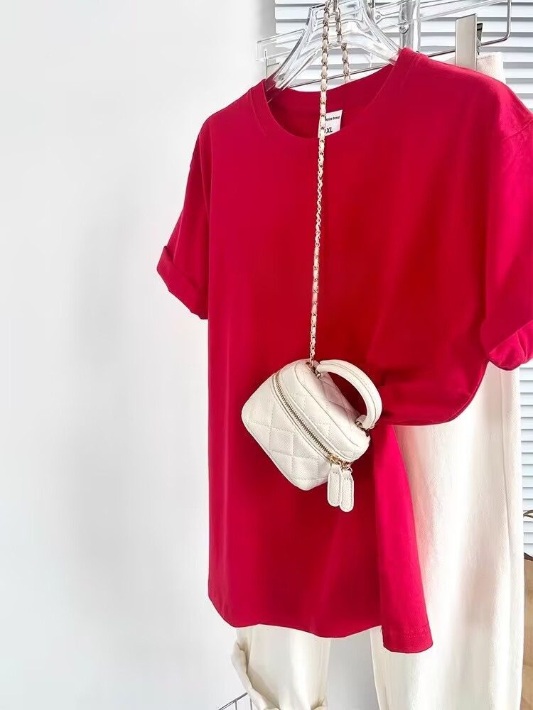 Главная страница > Розово-красная футболка с правым плечом 2025, женская летняя новая свободная хлопковая футболка с короткими рукавами, персонализированный топ
