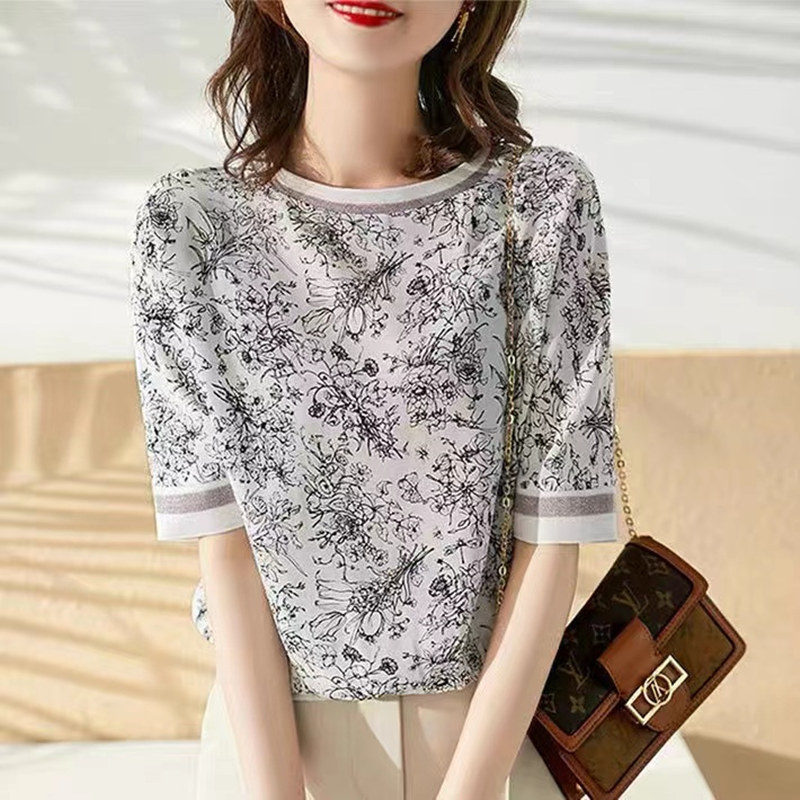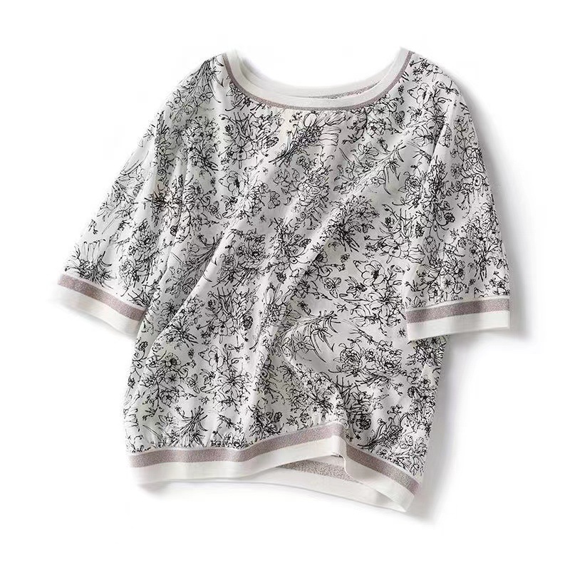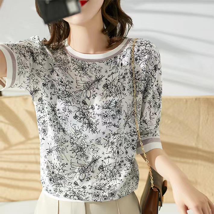 Главная страница > Внешняя торговля толстые чернила светлые чернила печать с круглым вырезом футболка женская с коротким рукавом новый летний Французский Ретро Шелковый Топ тутового дерева