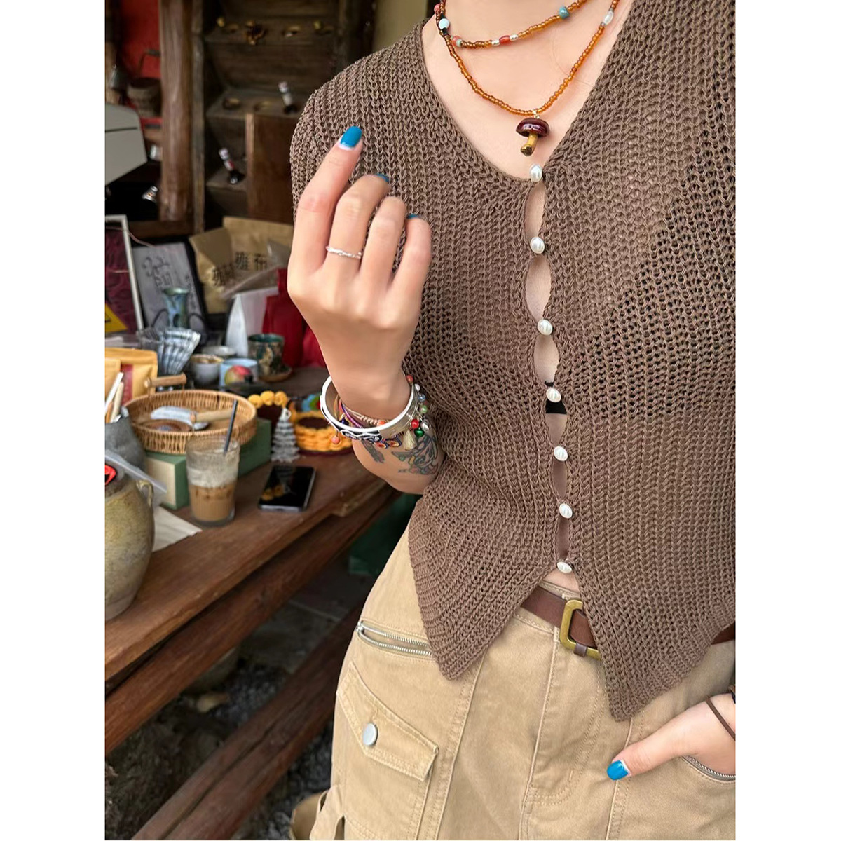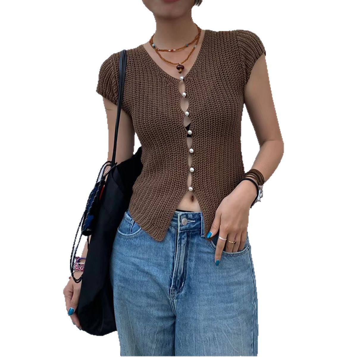 Главная страница > Женский короткий трикотажный кардиган с прозрачными жемчужными пуговицами, стиль «чистая страсть», лето 2025, новый стиль, V-образный вырез, облегающий, сексуальный топ