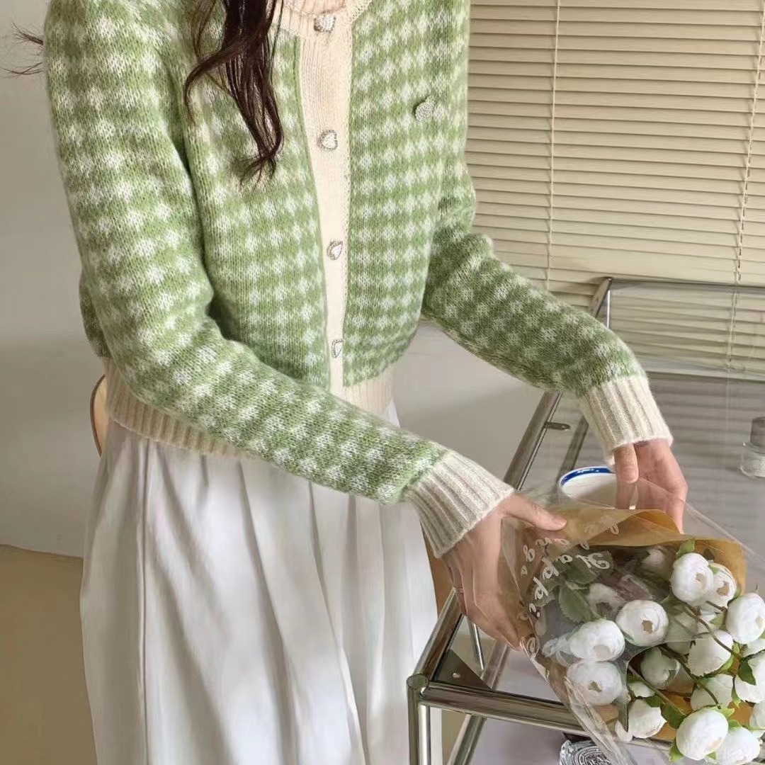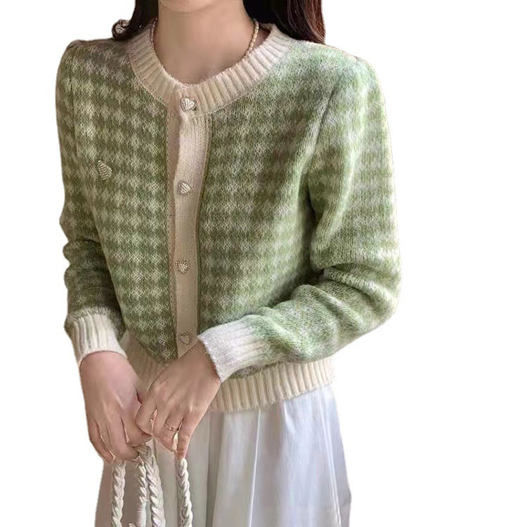 Главная страница > Вязаный кардиган Интернет-знаменитости, элегантный повседневный маленький ароматный стиль, клетчатый топ с круглым вырезом и длинными рукавами, весенне-осенний свитер 202, женская верхняя одежда