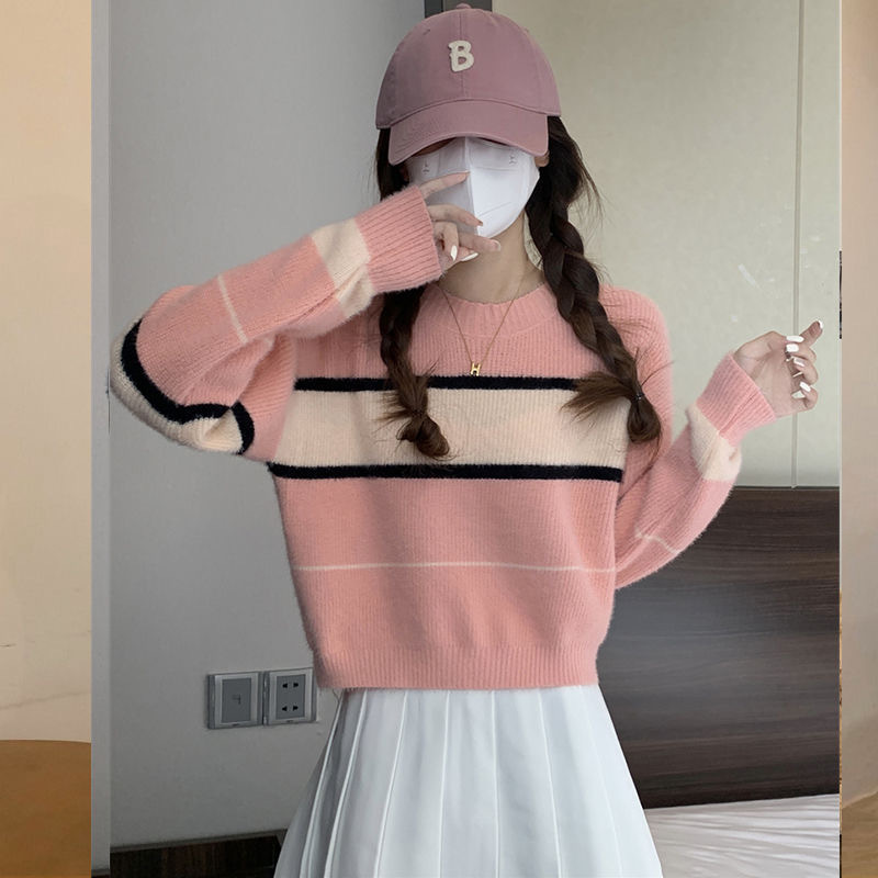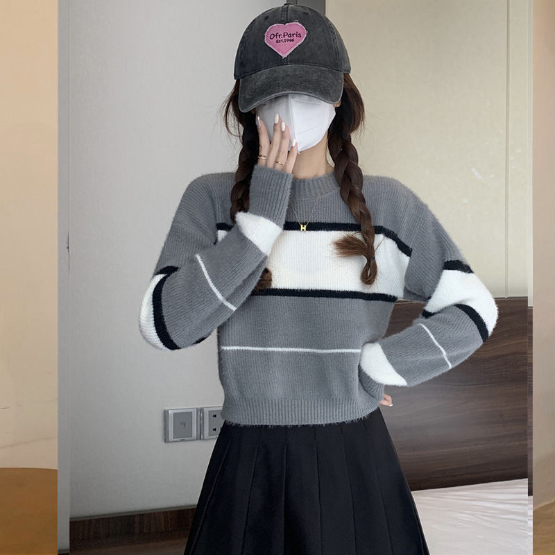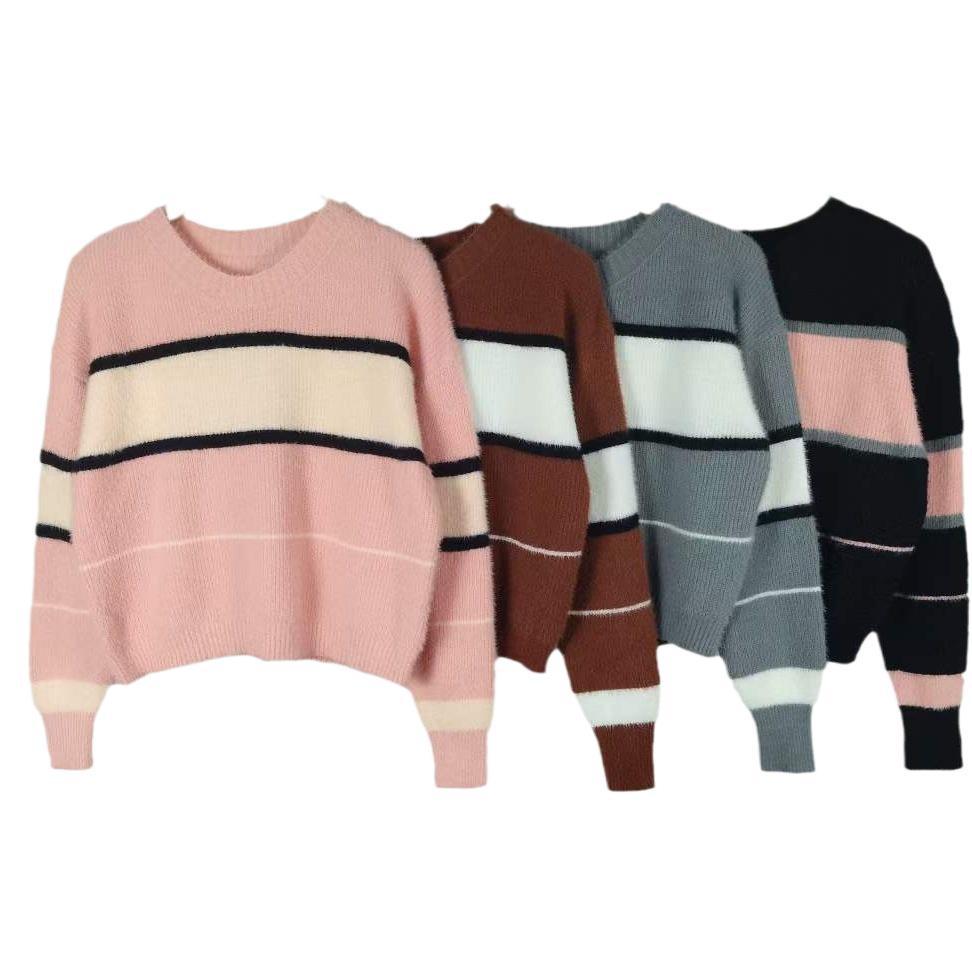 Мягкий клейкий нежный полосатый ленивый ветер осень-зима новый свитер женский тонкое ретро имитация норки сладкий пряный трикотаж прилив