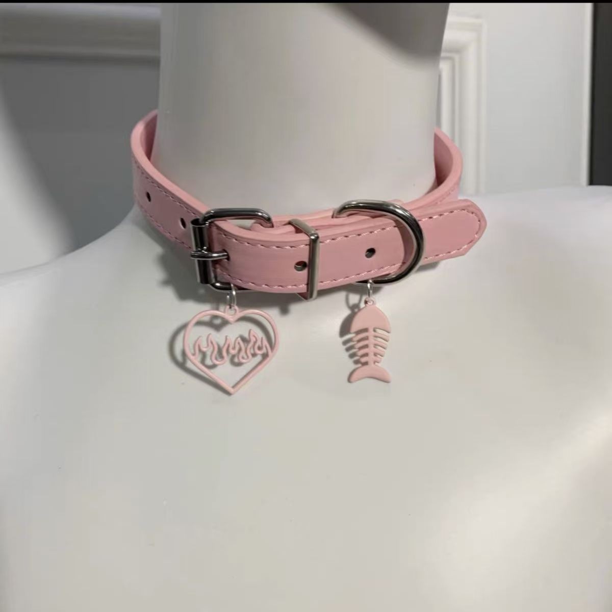 Розовый ошейник в виде рыбьей кости с сердечками - X5505A
