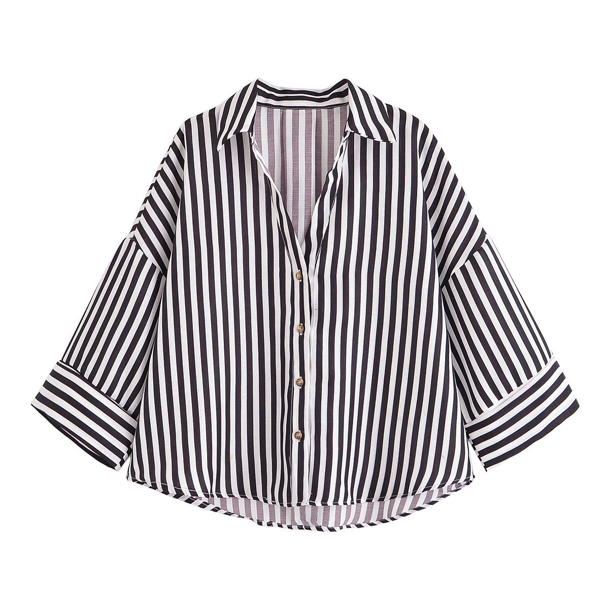 Главная страница > 外贸2025春夏新款欧美风女时尚休闲百搭翻领条纹宽袖衬衫 2363801