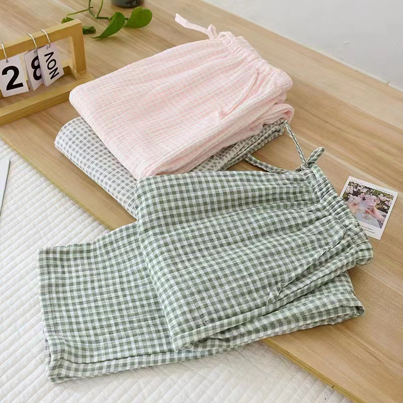 Главная страница > Оптовая продажа весенне-летних пижамных брюк для пар, марлевые брюки из выстиранного хлопка, тонкие мужские и женские домашние креповые брюки в Японскую клетку