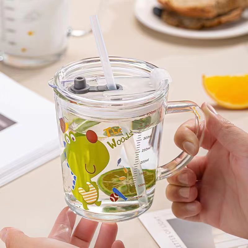 Ren Wind Cup Большая емкость чашка для завтрака Овсянка слон 400ml с шкалой с крышкой соломкой Детская стеклянная чашка для воды