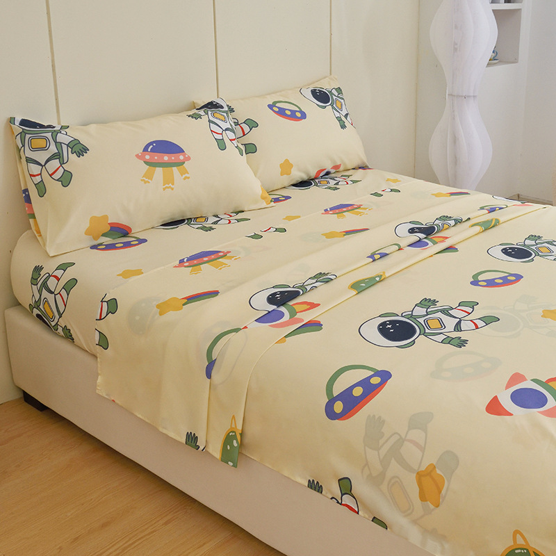 Детский комплект постельного белья из хлопка с астронавтами для мальчиков, пододеяльник с мультяшным рисунком, простыня на резинке, комплект из четырех предметов, ткань с эффектом звездного неба.