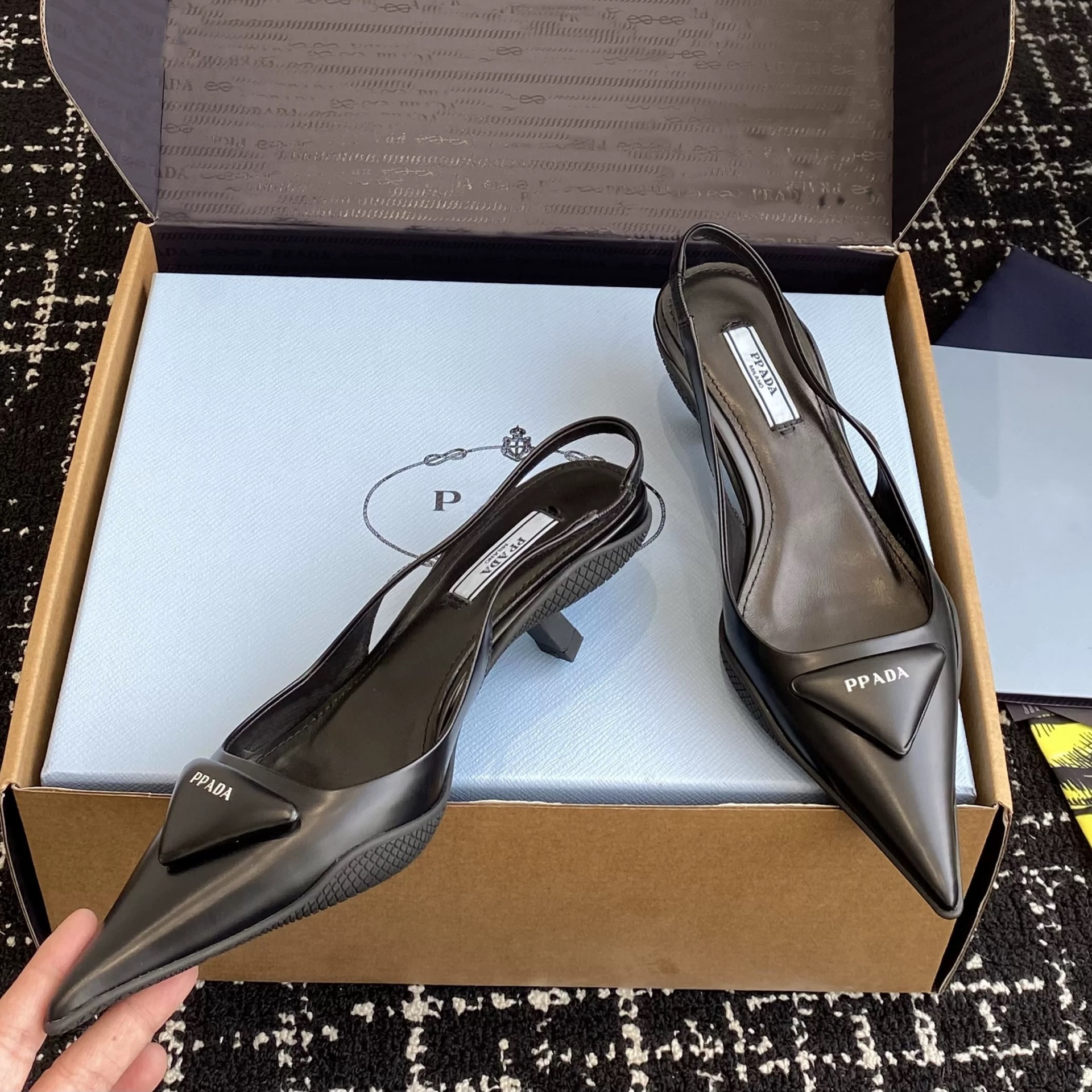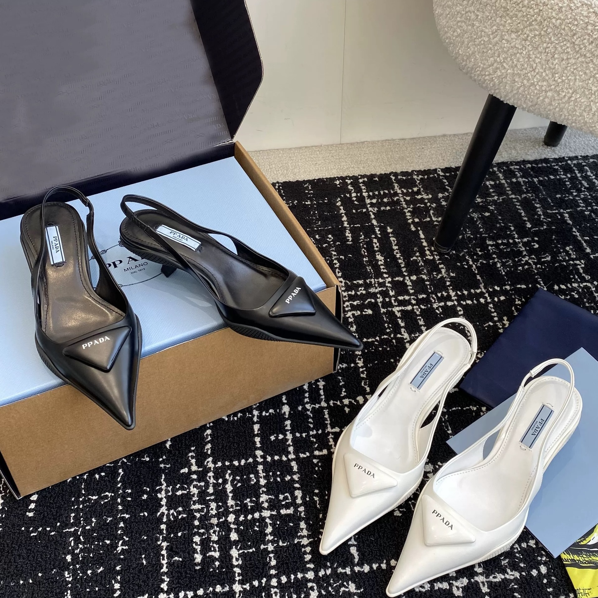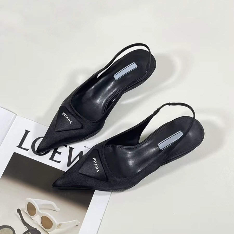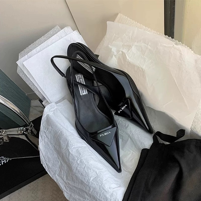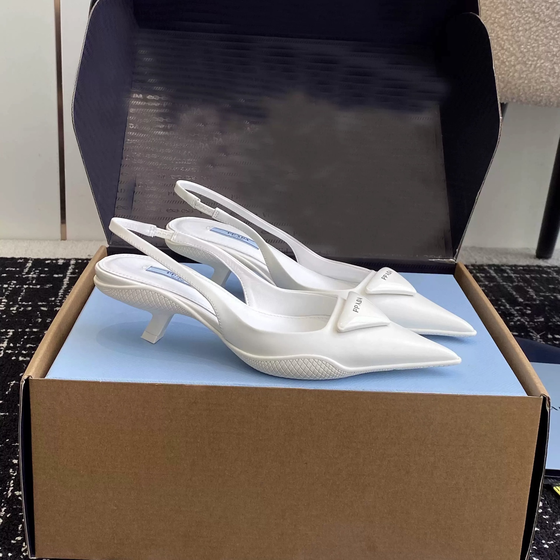 Лето 2025 г., брендовые сандалии P с треугольным логотипом, интернет-знаменитости, женские сандалии на остром каблуке с кошачьим каблуком, закрытый носок, неглубокий вырез, высокие каблуки с ремешком на спине из натуральной кожи.