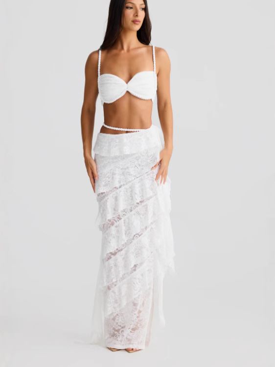 Главная страница > Пляжный курортный стиль чистый костюм женский 2025 новый летний пояс без спинки индивидуальная кружевная юбка бедра