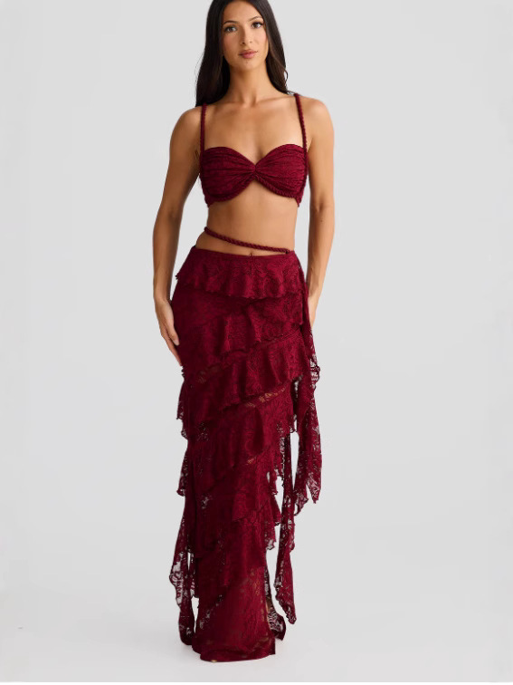 Пляжный курортный стиль чистый костюм женский 2025 новый летний пояс без спинки индивидуальная кружевная юбка бедра