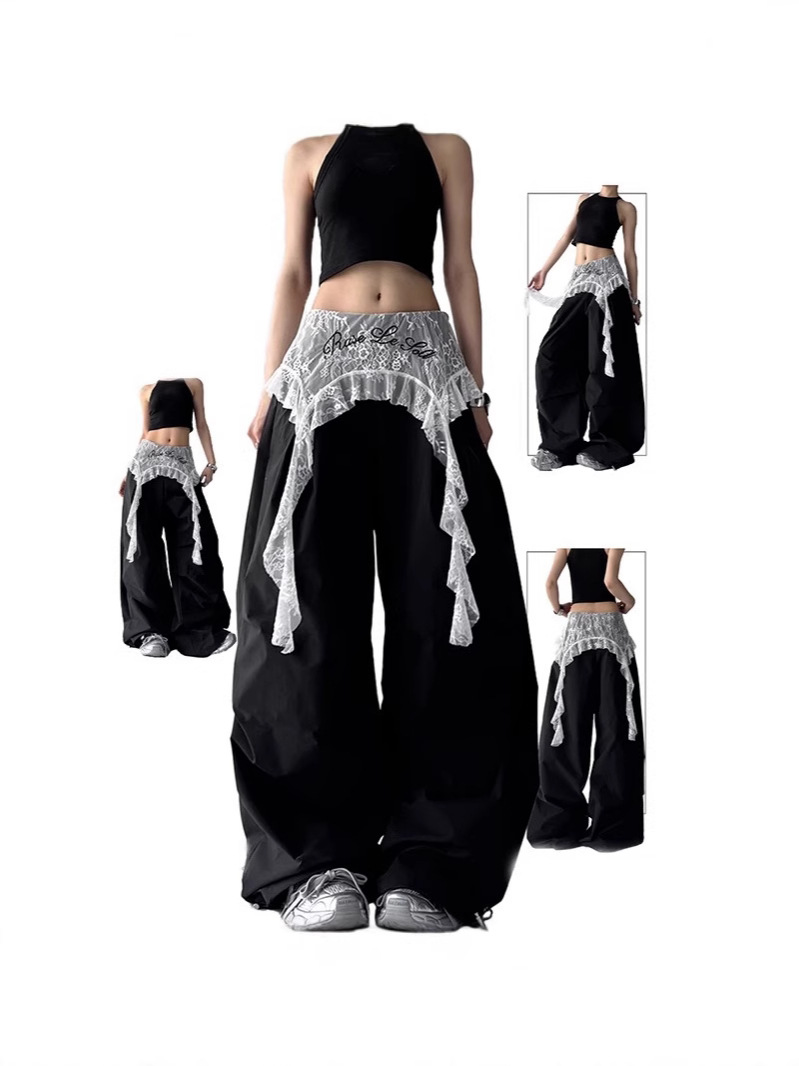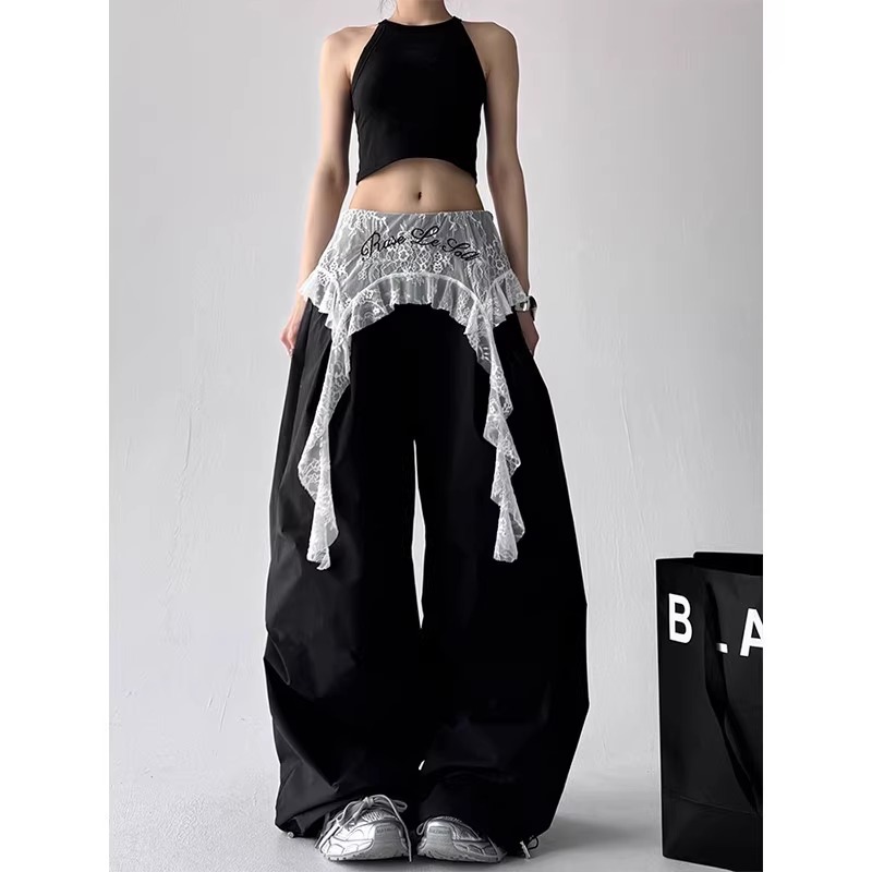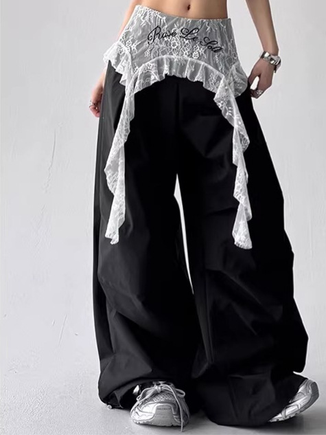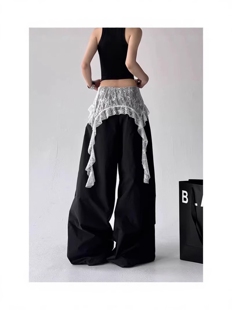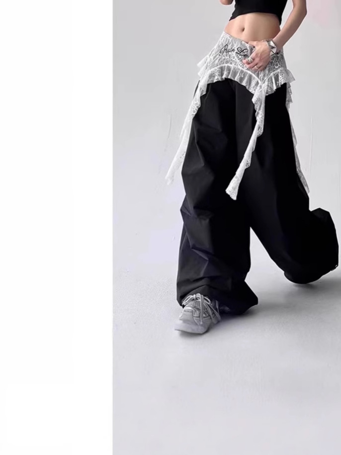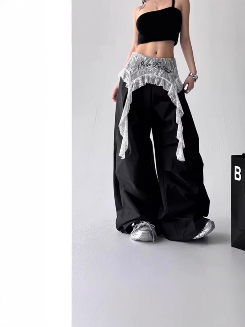 Главная страница > Милые и крутые широкие брюки с кружевом для девочек, летние новые дизайнерские нишевые свободные утягивающие повседневные длинные брюки
