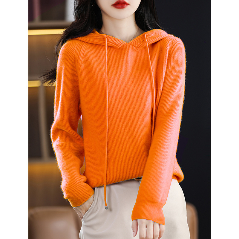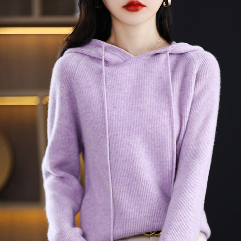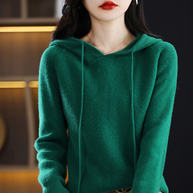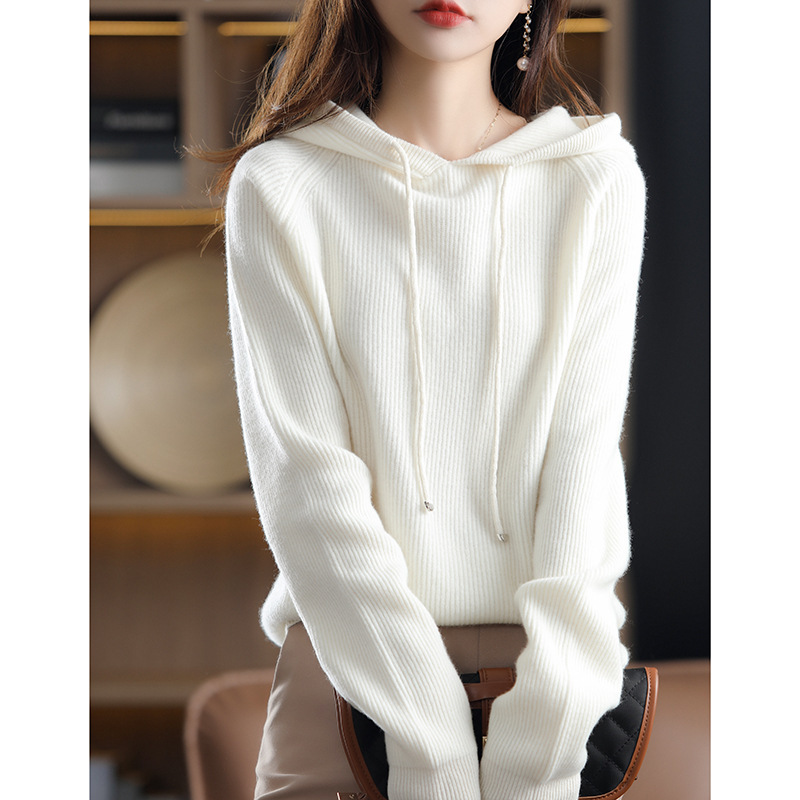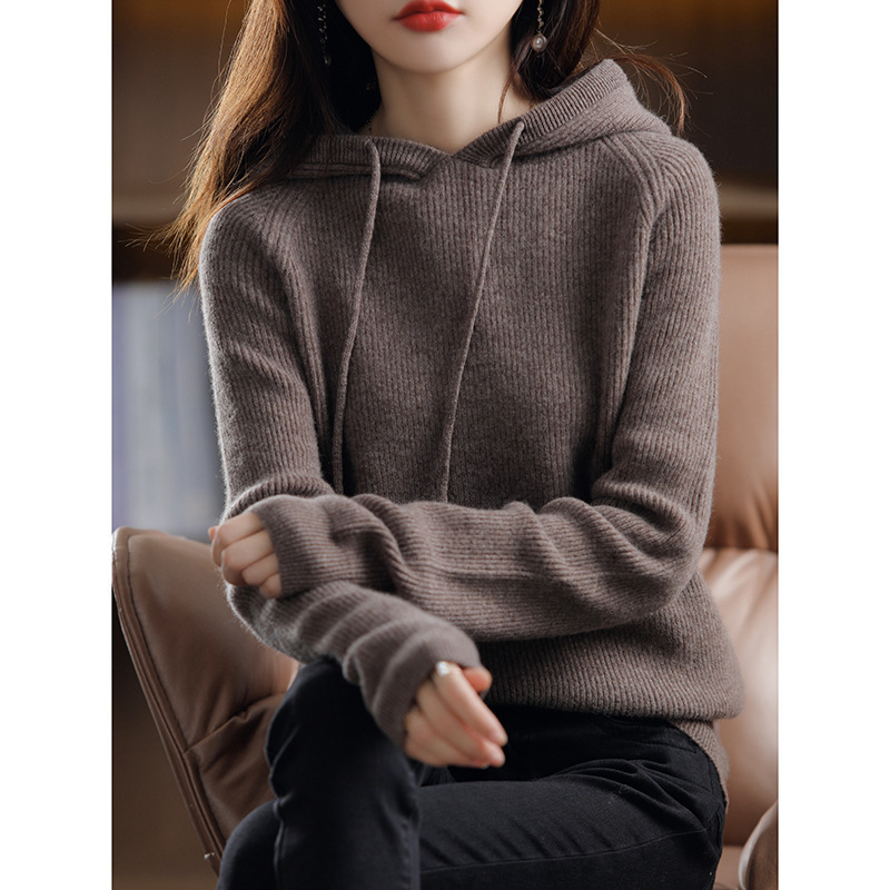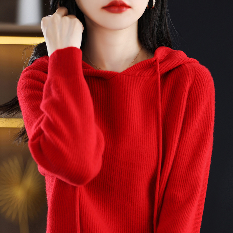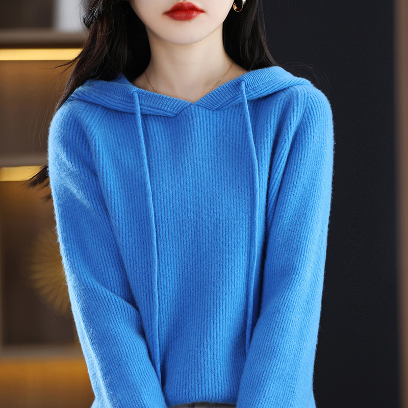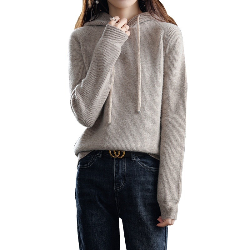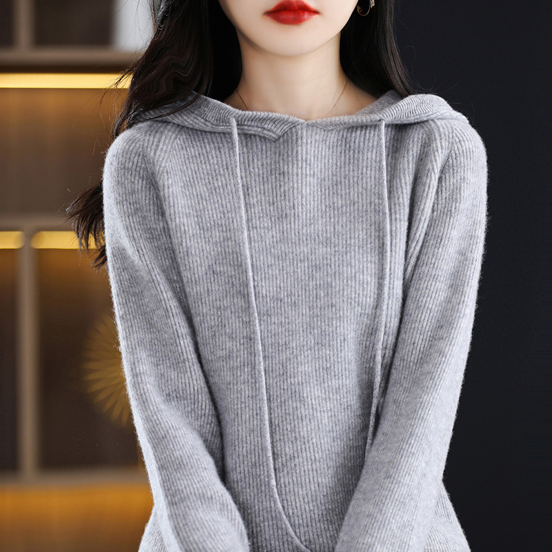 Главная страница > Вязаный свитер с капюшоном из 100% австралийской чистой шерсти, Женская утолщенная кашемировая толстовка с капюшоном, свободный свитер больших размеров с капюшоном