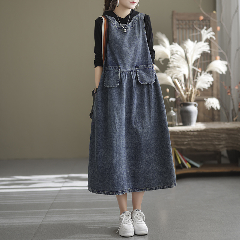 Главная страница > Джинсовое Платье женское на весну и лето с круглым вырезом, повседневное художественное свободное приталенное винтажное женское платье-жилет средней длины, большие размеры, юбка