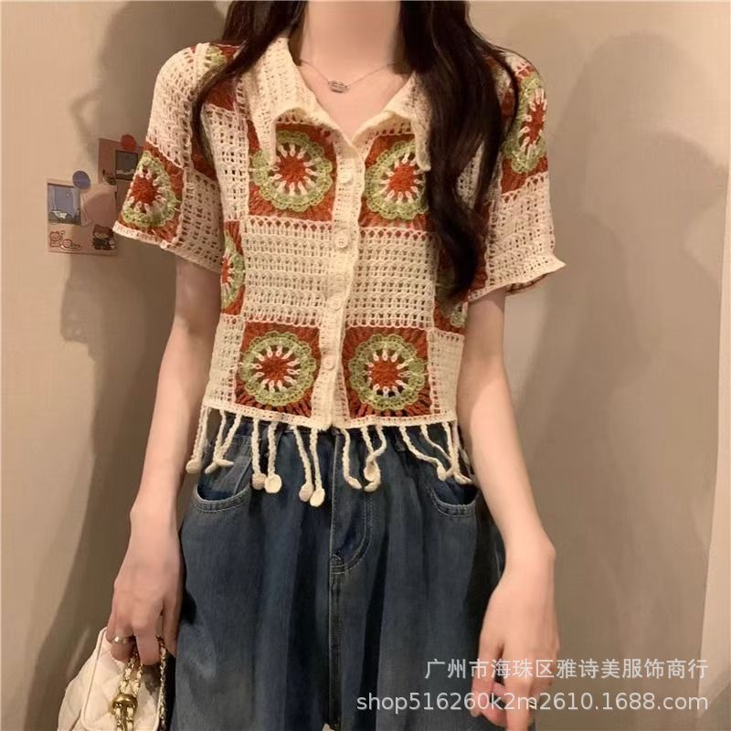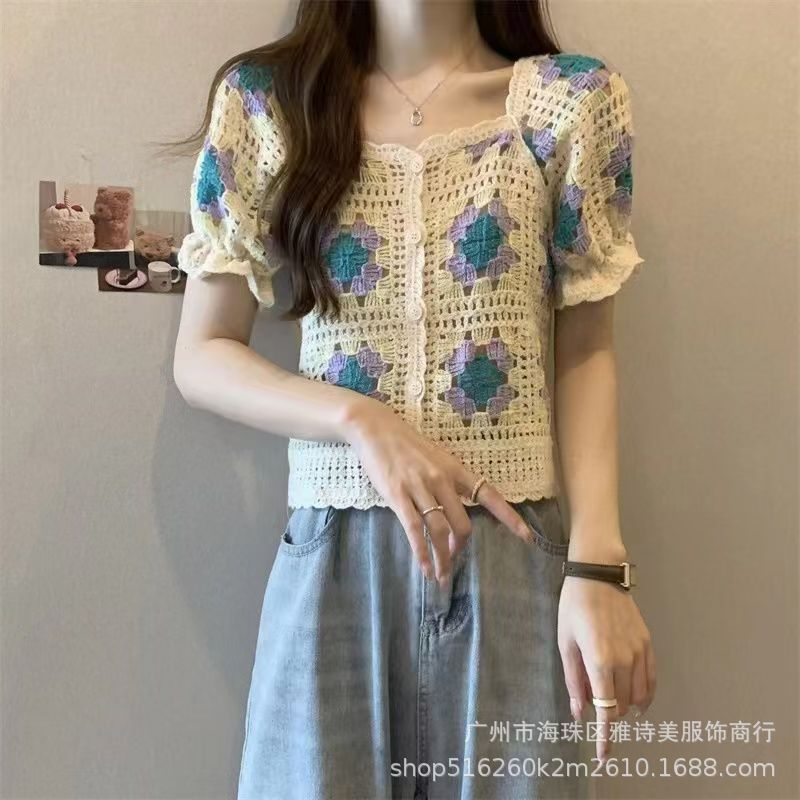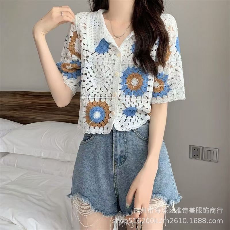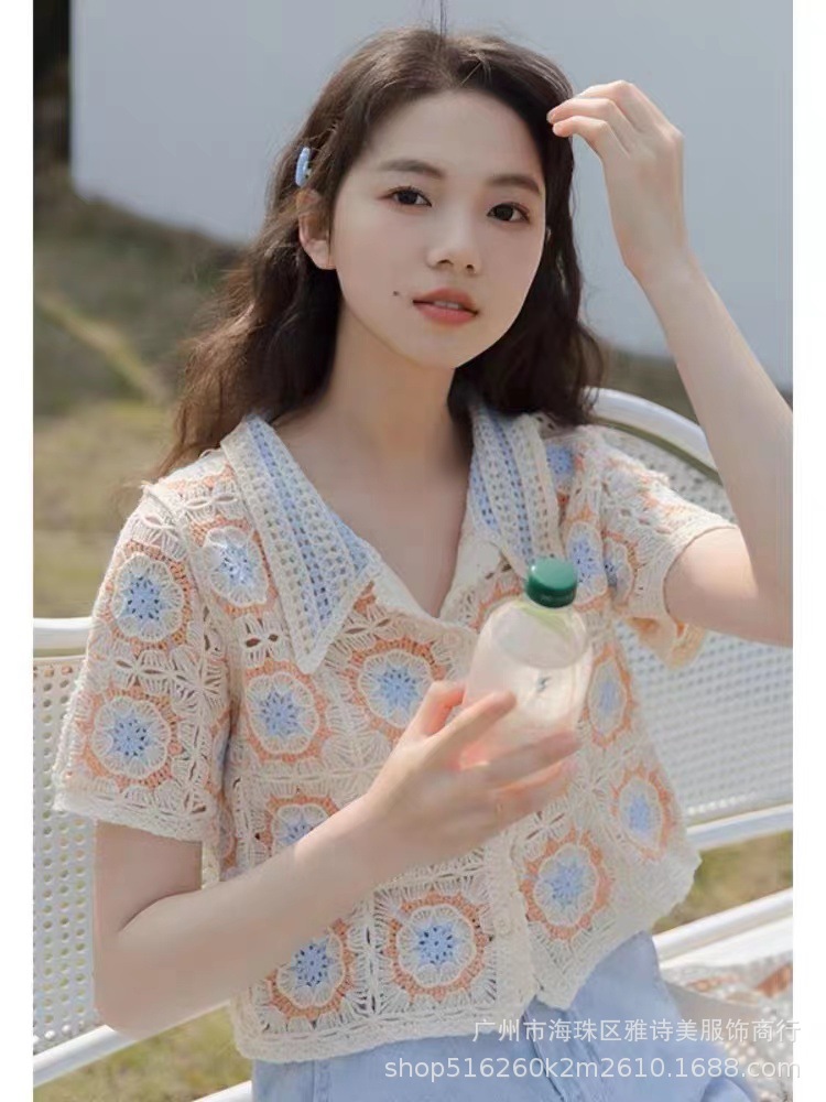 Главная страница > Новый маленький свежий воротник поло с коротким рукавом вязаный кардиган женский летний тонкий полый крючок цветок ниша шикарная короткая куртка