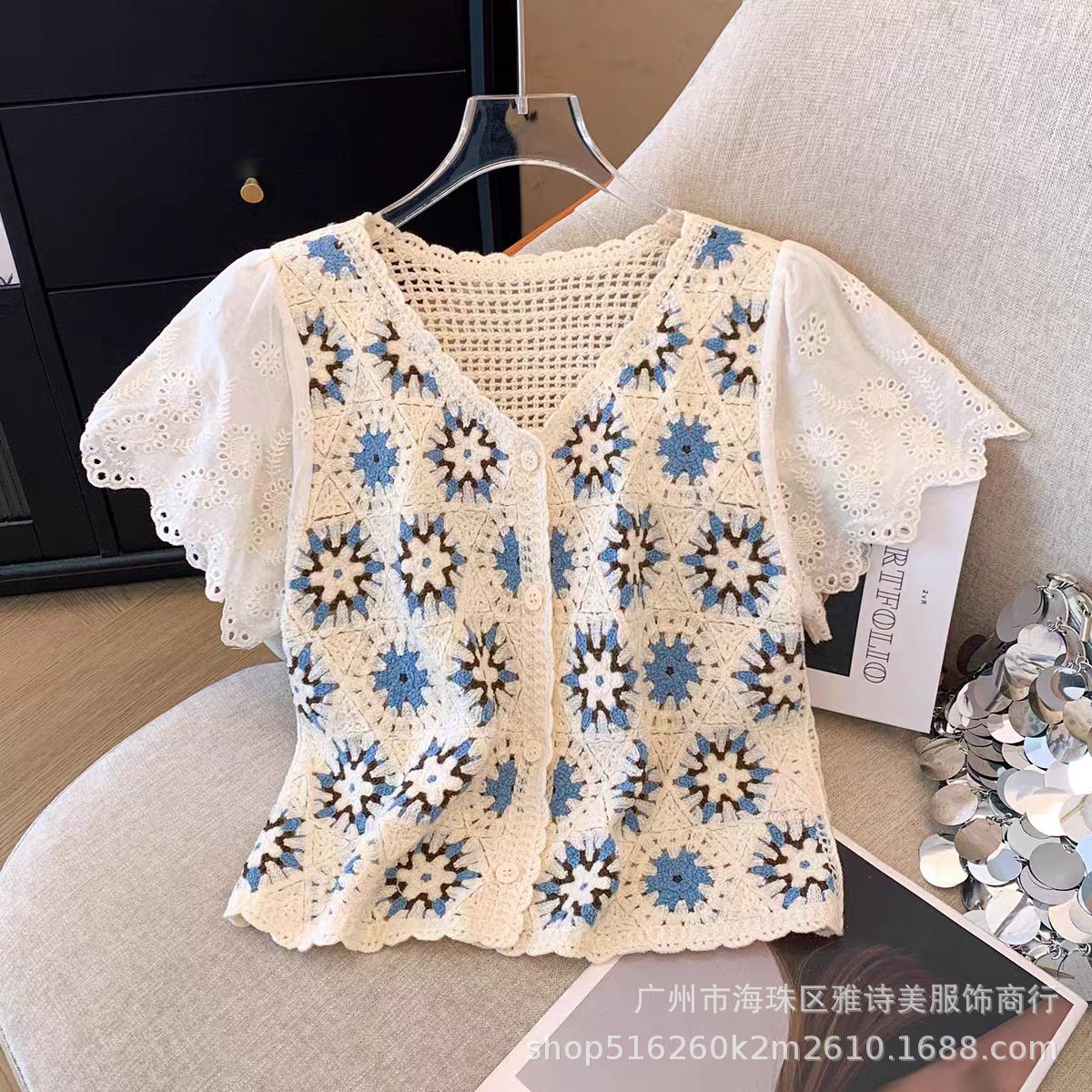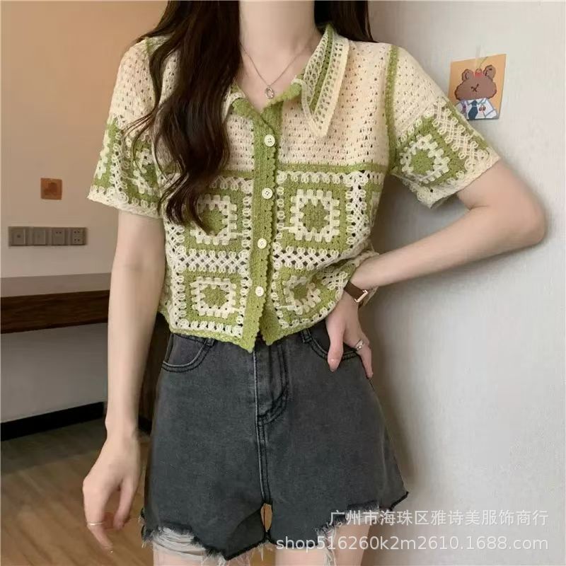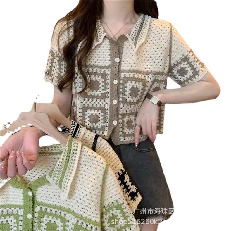 Новый маленький свежий воротник поло с коротким рукавом вязаный кардиган женский летний тонкий полый крючок цветок ниша шикарная короткая куртка