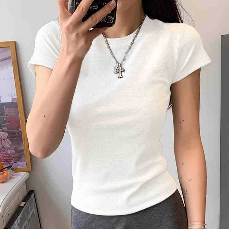 Белая футболка из чистого хлопка, Женская облегающая Летняя короткая однотонная облегающая Базовая рубашка с короткими рукавами, элегантный топ с внутренней стороны