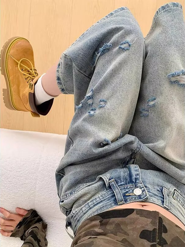 Главная страница > Укороченные джинсовые брюки с рваными краями в американском стиле для женщин, летние тонкие свободные прямые брюки средней длины, шорты больших размеров.