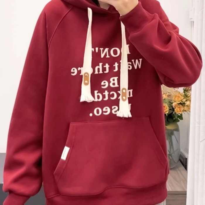 Толстовка больших размеров на флисовой подкладке утолщенная Женская толстовка с капюшоном 2023 зимняя свободная композитная куртка с буквенным принтом и шнурком