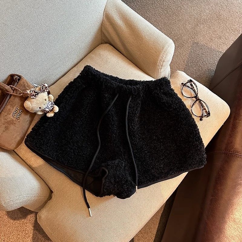 Элегантная талия шнурки из ягненка женские зимние новые теплые наружные повседневные шорты свободные широкие брюки