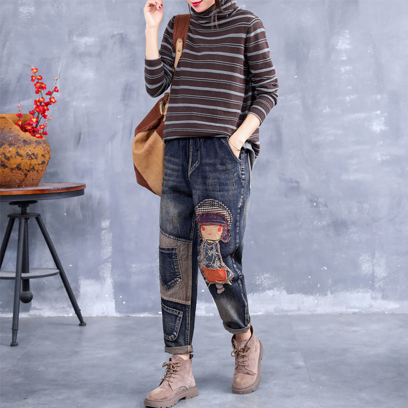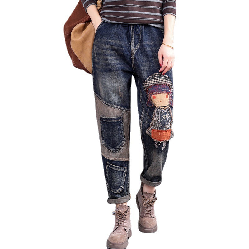 Главная страница > [Готовые запасы] свободные джинсы, новые женские повседневные брюки-шаровары с эластичной резинкой на талии, большие размеры, ретро-нашивка с вышивкой