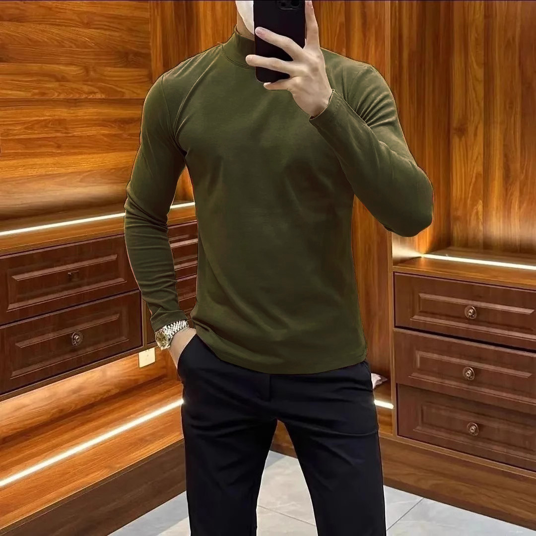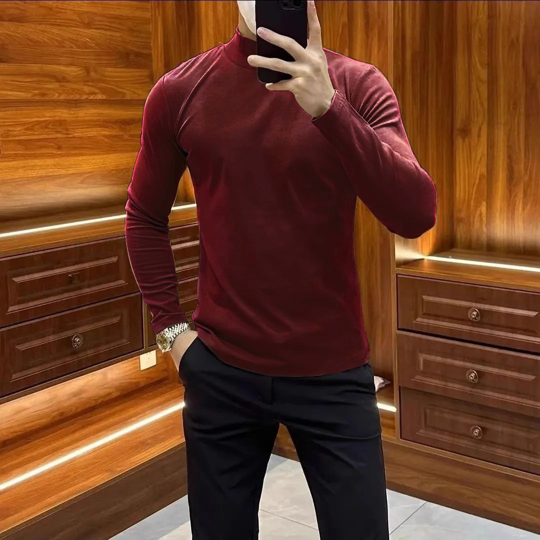 Главная страница > Delong мужская осенняя и зимняя чистая версия высокого класса с полувысоким вырезом сплошной тонкая тонкая рубашка с длинными рукавами с высокой эластичной нижней рубашкой теплая футболка