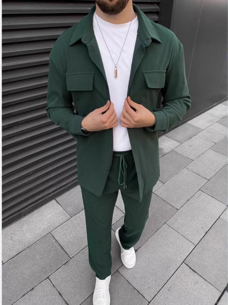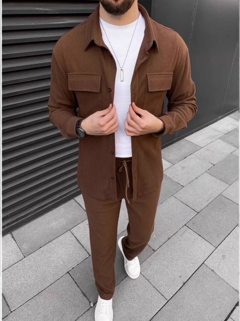 Главная страница > 2025 трансграничный весенний новый европейский и американский мужской вельвет с длинным рукавом с отворотом рубашка брюки повседневный повседневный набор