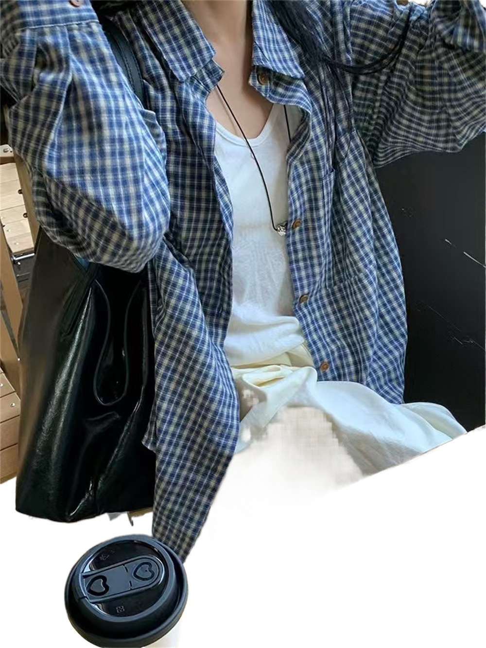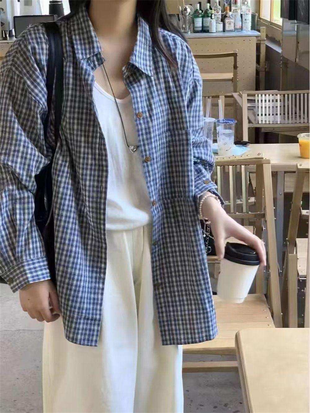 Главная страница > Ретро синяя рубашка с длинным рукавом в клетку для женщин, ранняя осень, стиль ленивого топа, повседневная клетчатая куртка, свободная верхняя рубашка
