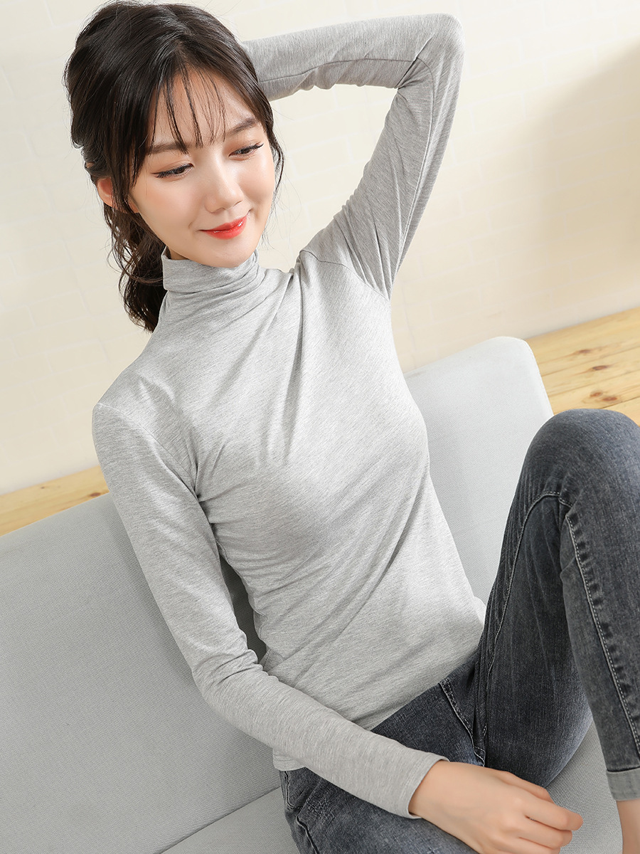 Главная страница > Женская футболка с длинными рукавами из модала, облегающий топ с высоким воротником для осени и зимы, сложенный воротник, тонкий осенний топ, оптовая продажа от производителя.