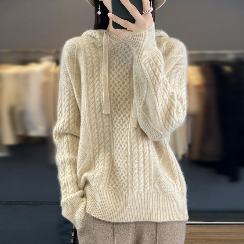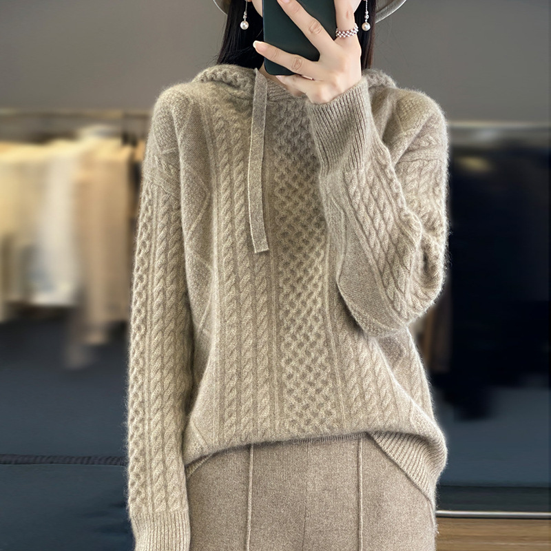 Главная страница > Осенне-Зимний новый свитер из 100 чистой шерсти, Женский однотонный пуловер с капюшоном, свитер с капюшоном, свободная вязаная основа для похудения