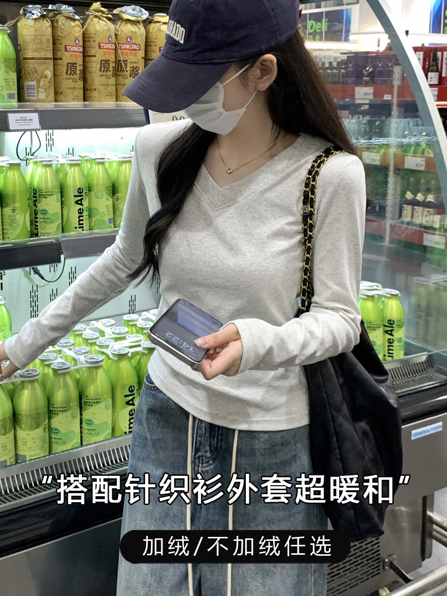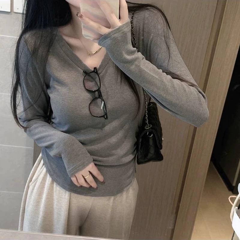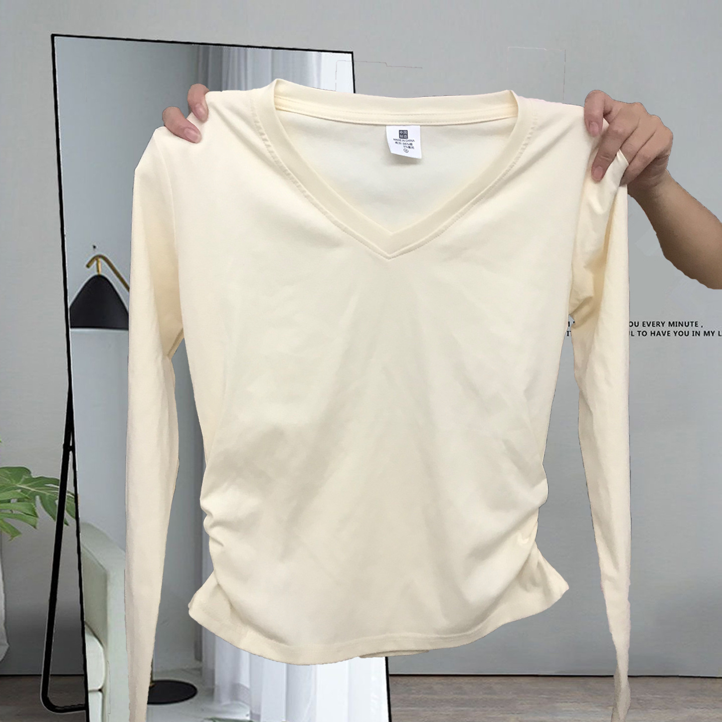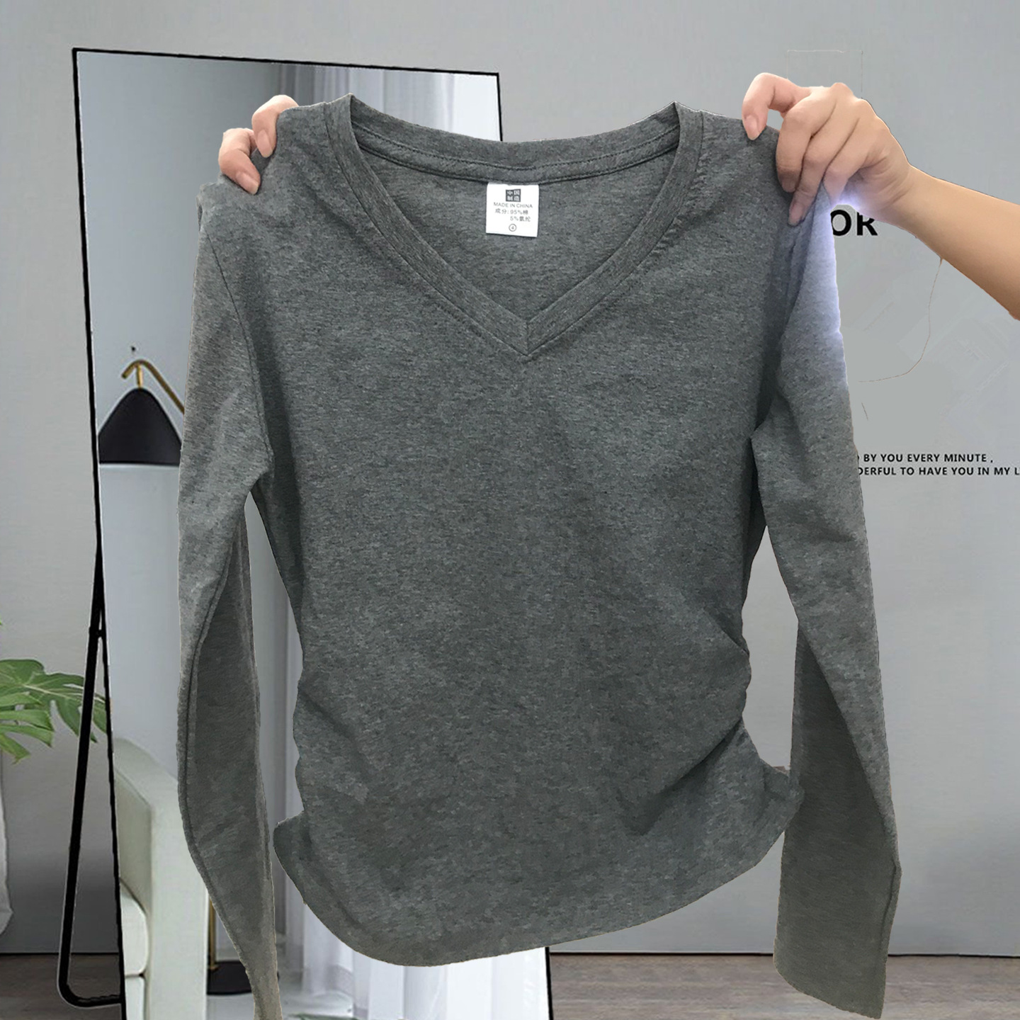 Главная страница > Весенне-осенняя женская футболка с v-образным вырезом из тонкого чистого хлопка с длинными рукавами, облегающим кроем и талией, облегающим низом на правое плечо, топ на зиму