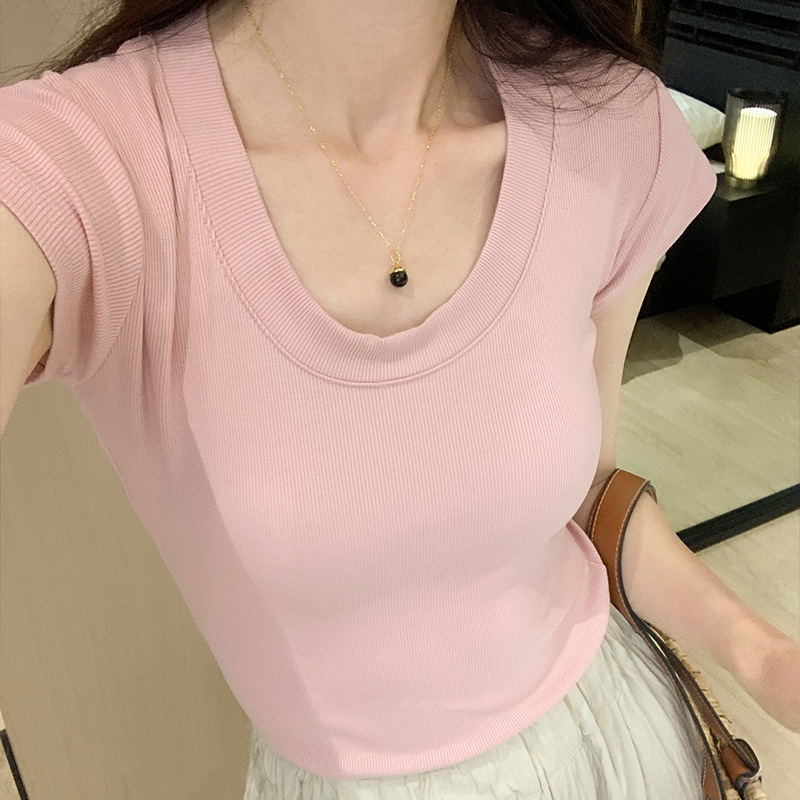 Главная страница > Женская футболка с открытыми плечами Real Shot, с короткими рукавами, летняя облегающая однотонная Базовая рубашка, облегающий топ с U-образным вырезом