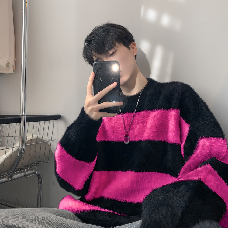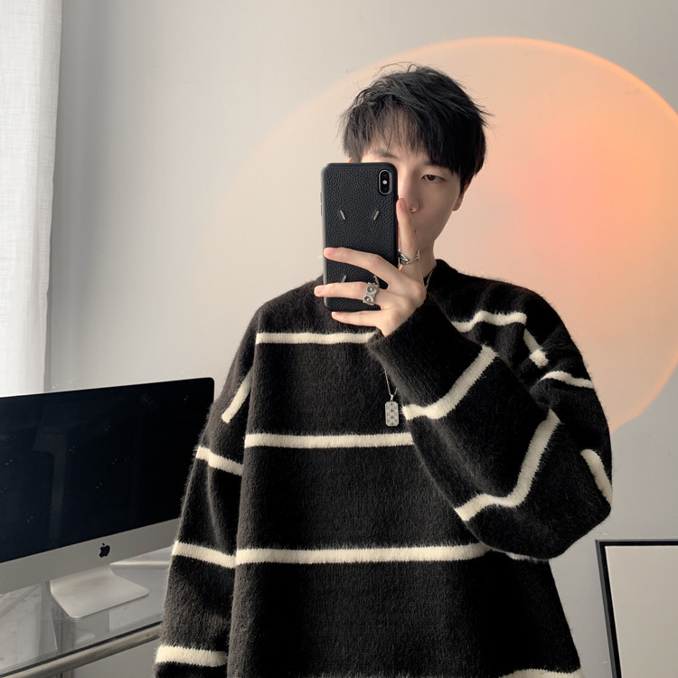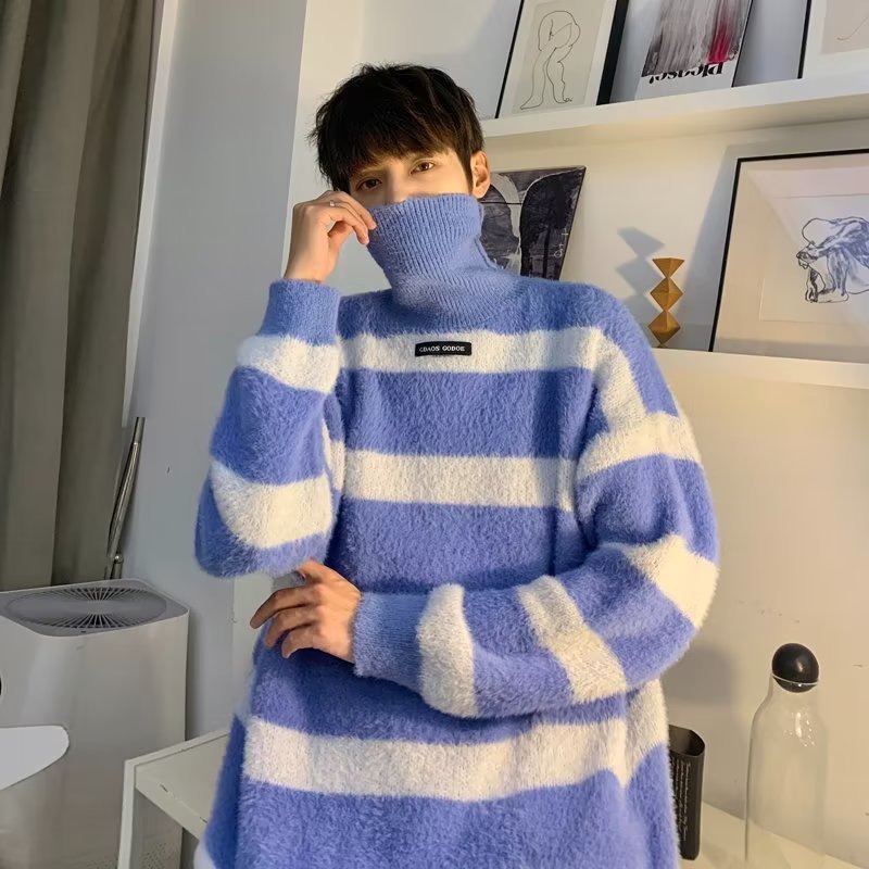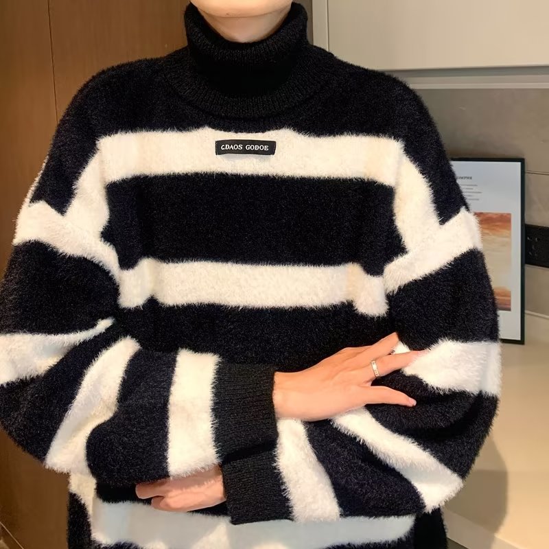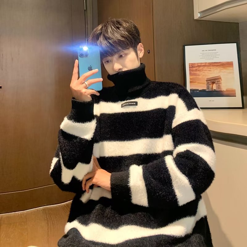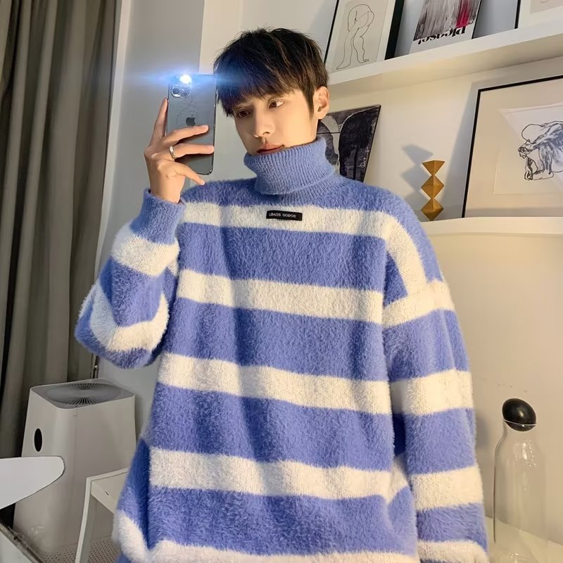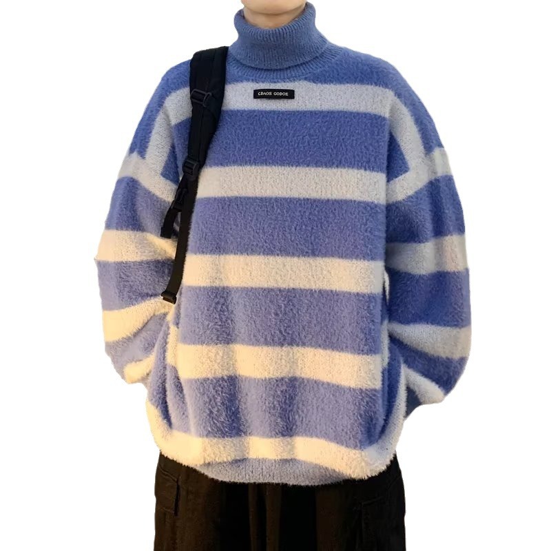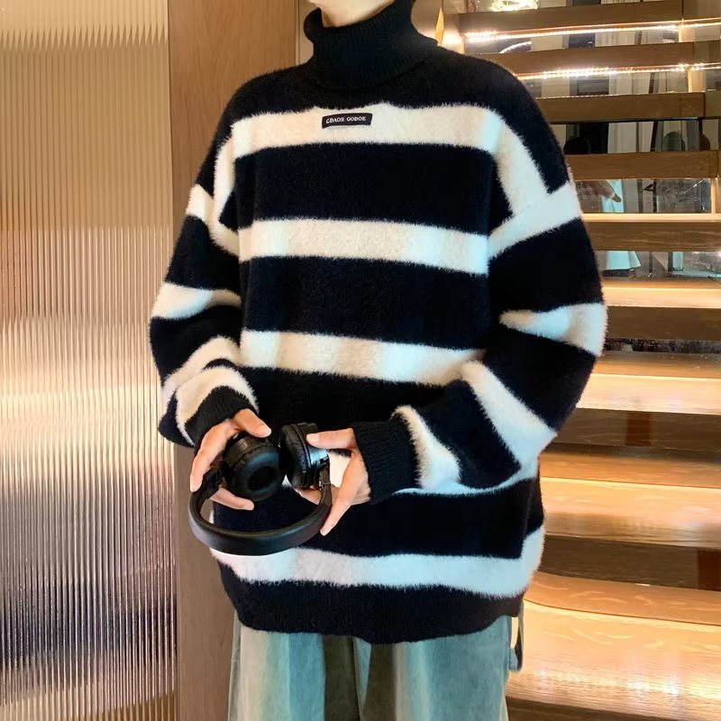 Главная страница > Водолазка Мужская осень и зима 2023 Новый утолщенный вязаный свитер в полоску Свободная ленивая теплая куртка Базовая рубашка