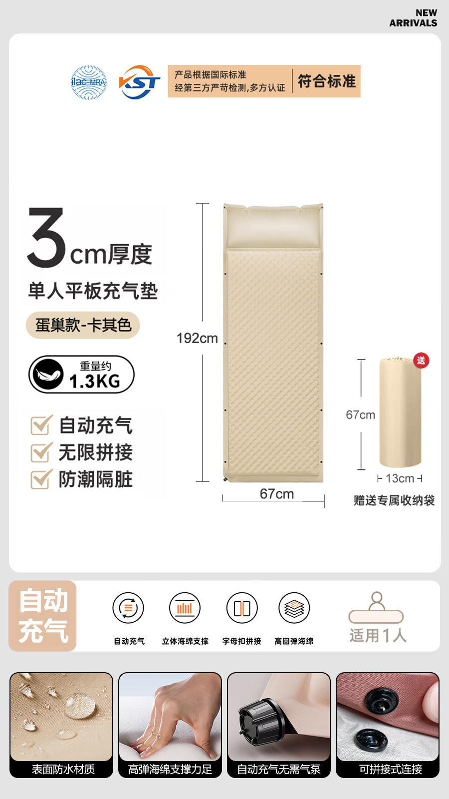 【192*67*3 см】Автоматический надувной коврик для одного человека (гарантия 1 год)