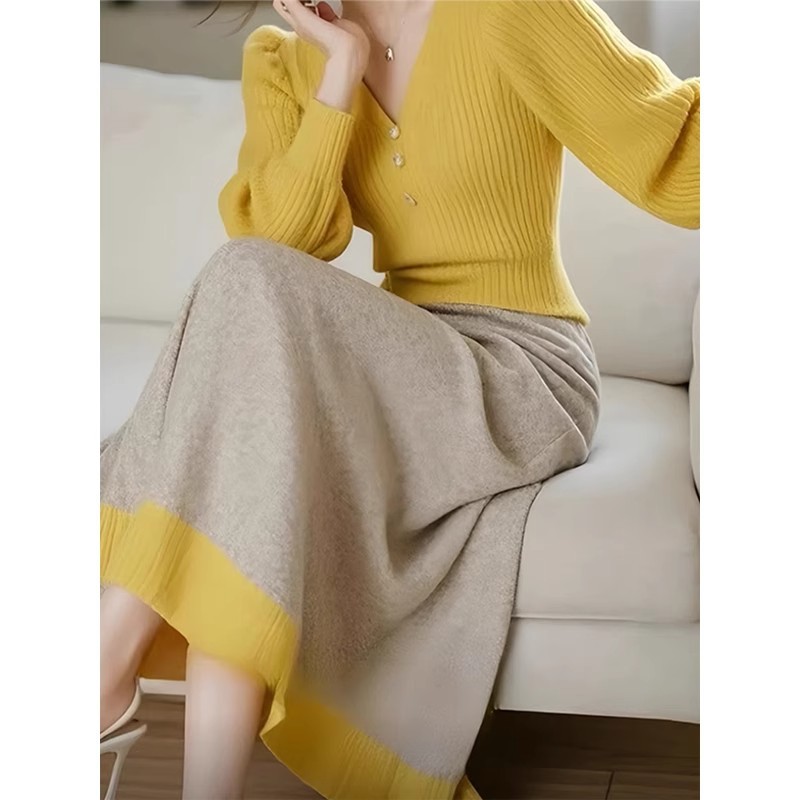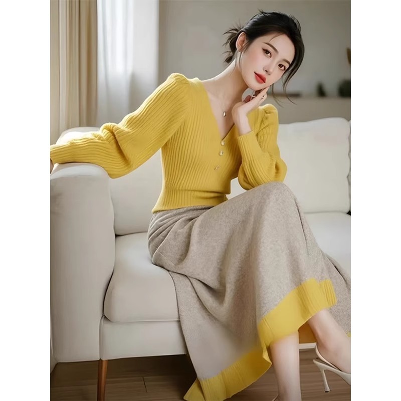 Главная страница > Мудрец текстурный повседневный костюм женский v-образный воротник с длинным рукавом трикотажный топ юбка из двух частей осенняя новая женская одежда