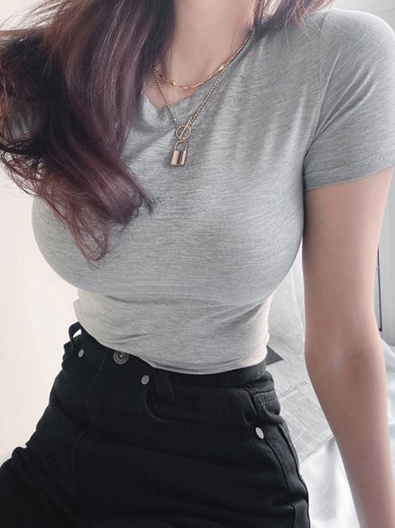 Главная страница > Новинка 2025 года, женская тонкая рубашка с короткими рукавами, белая облегающая однотонная популярная черная футболка с круглым вырезом и половиной рукавов