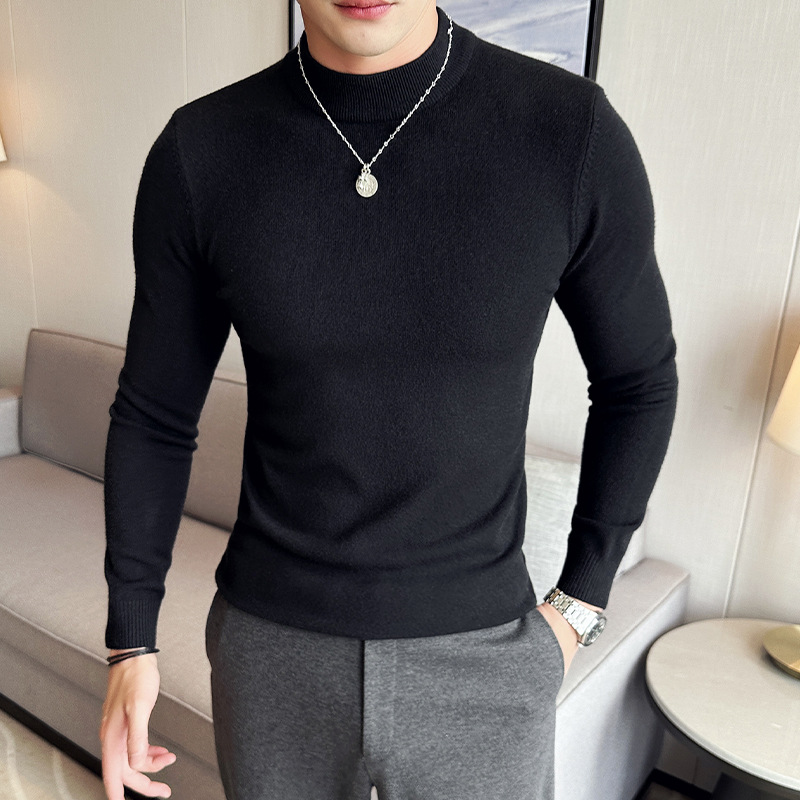 Главная страница > Мужской зимний свитер с флисовой подкладкой, утолщенный, с воротником средней высоты, черный трикотаж 2024 года, внутренний слой — трикотажная базовая рубашка.
