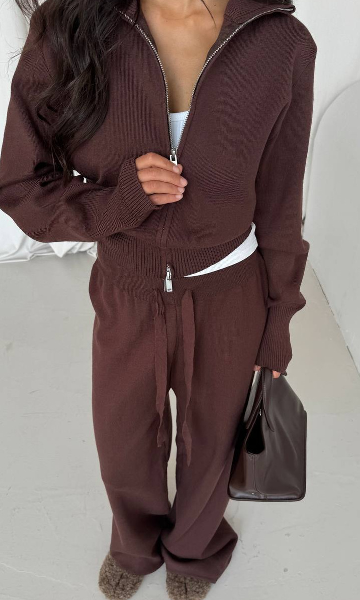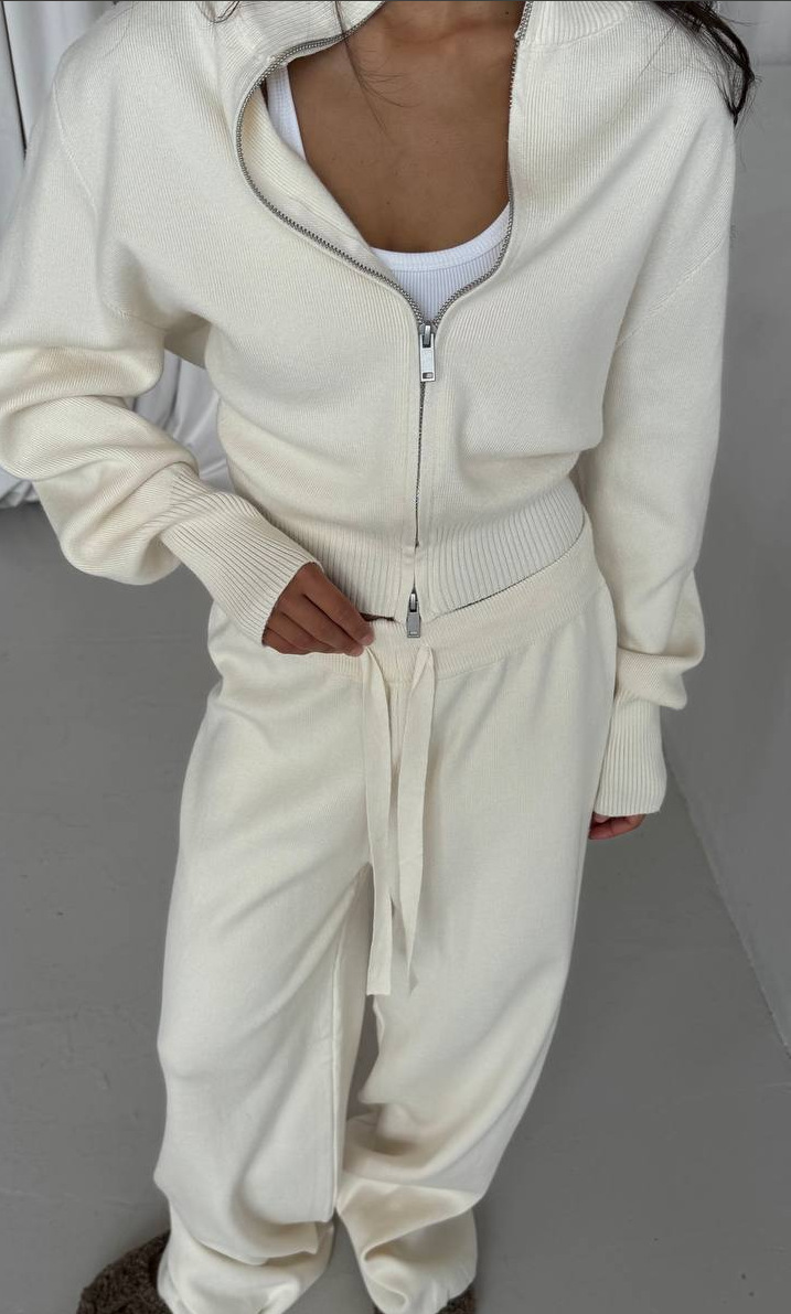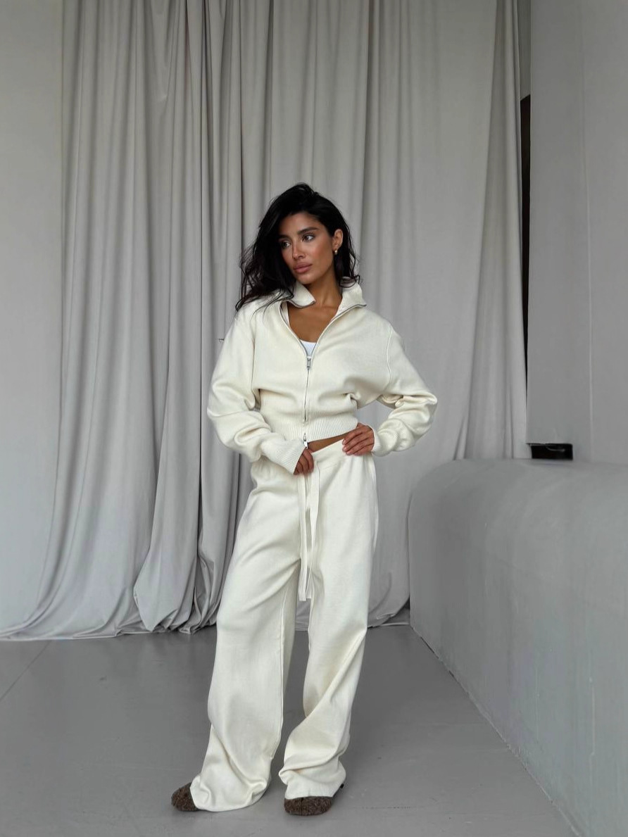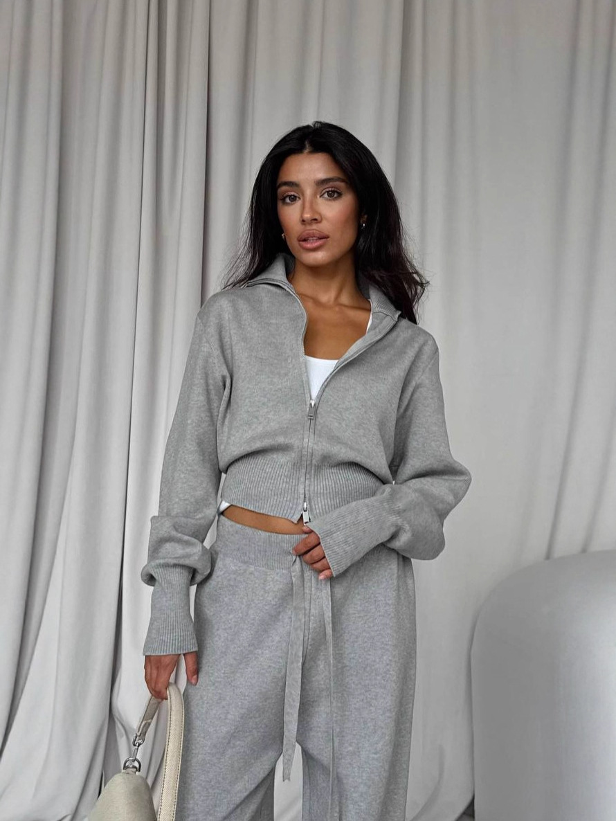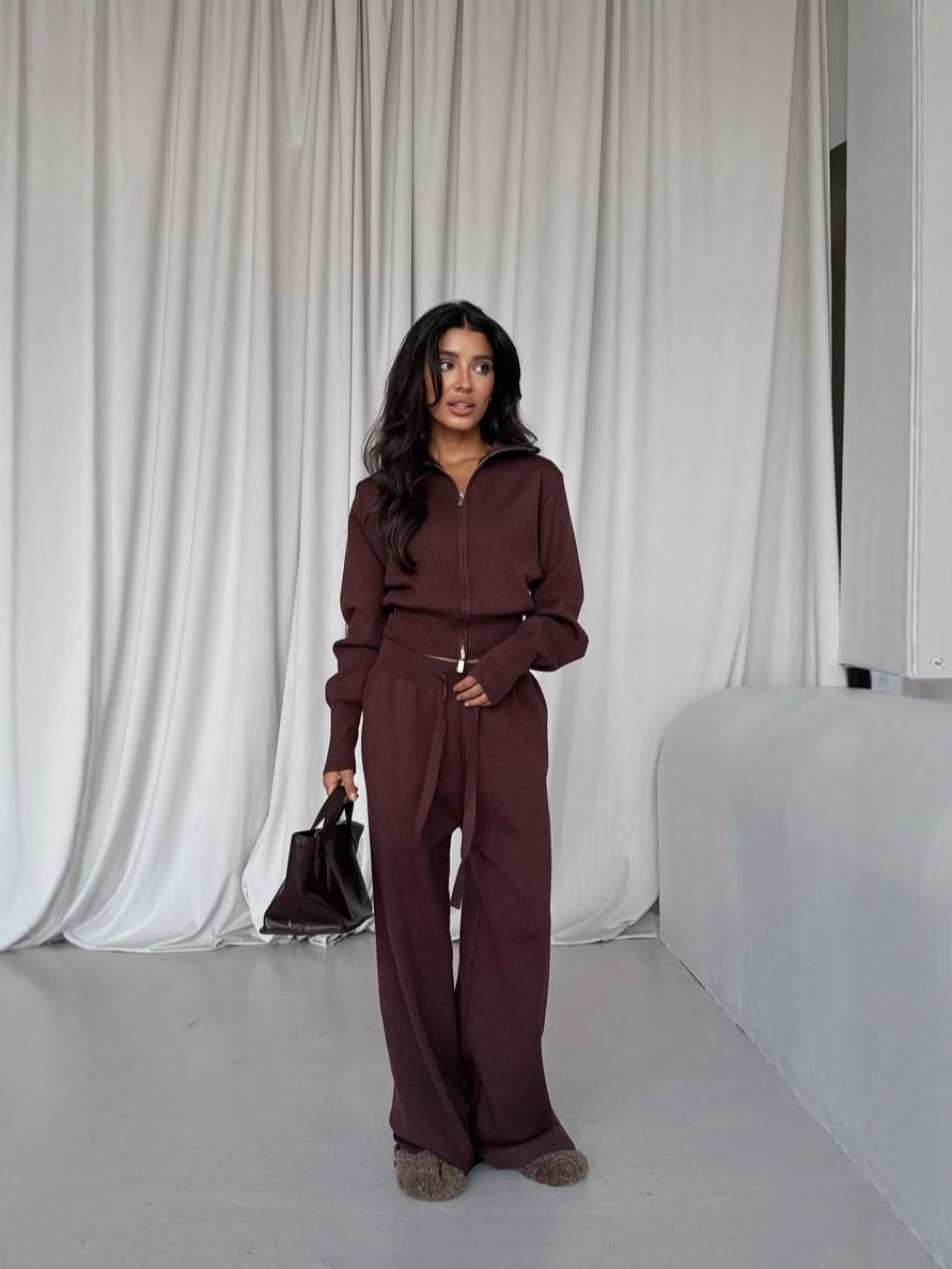 Женский костюм-двойка из трикотажа, осень 2025 года, однотонный, элегантный, прямой крой, для повседневной носки на улице.