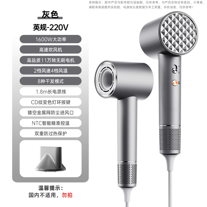 [Нейтральный британский стандарт] K2-grey-1600W + высокоскоростной бесщеточный двигатель 110 000 об/мин + кнопочный индикатор температуры воздуха + магнитное воздушное сопло-220 В