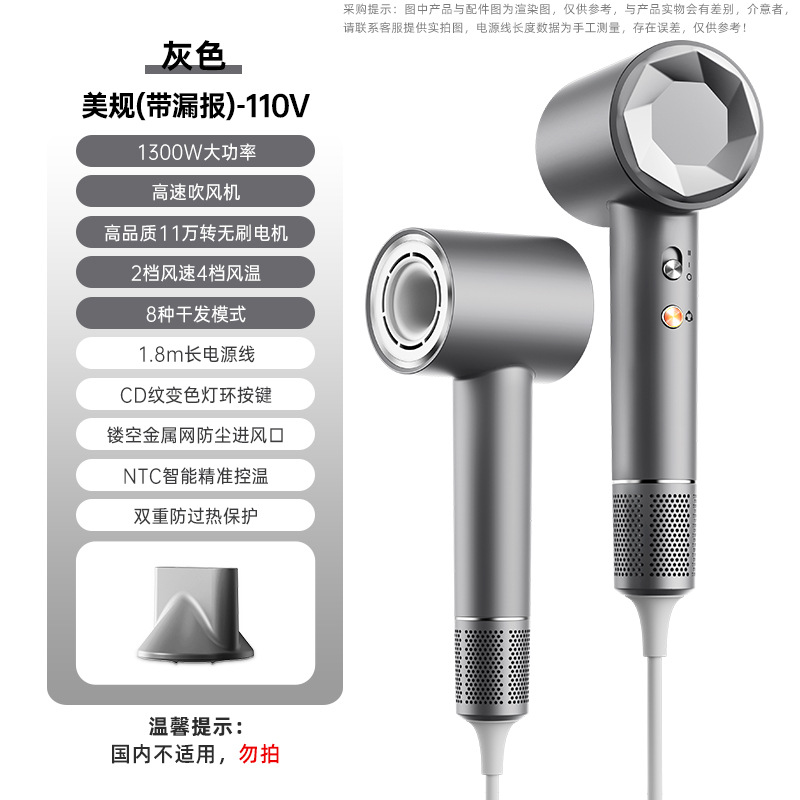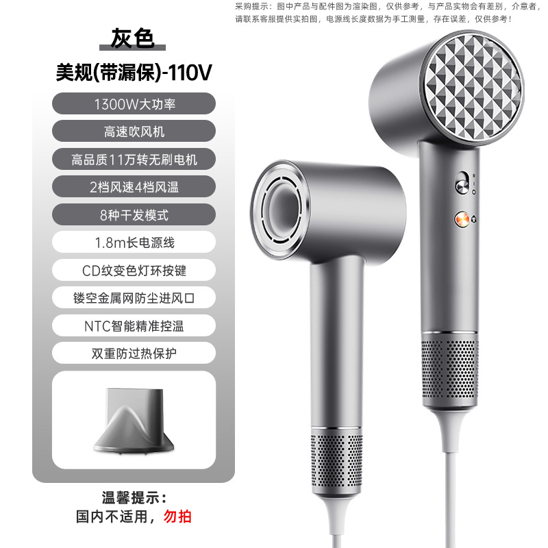 [Нейтральный американский стандарт (с защитой от утечек)] K2-grey-1300W+высокоскоростной бесщеточный двигатель 110 000 об/мин+кнопочный индикатор температуры воздуха+магнитное воздушное сопло-110В